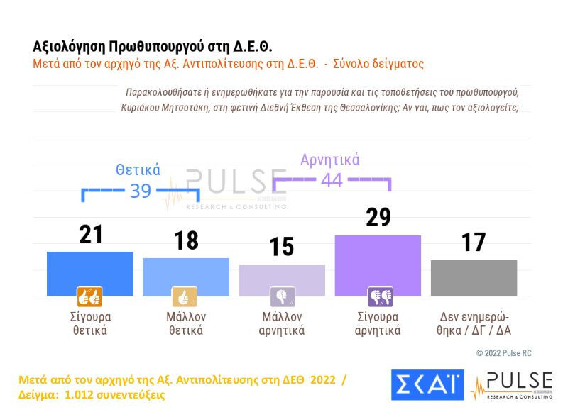 Η επόμενη κάρτα στη δημοσκόπηση αφορά την αξιολόγηση των δηλώσεων του Κυριάκου Μητσοτάκη στη ΔΕΘ. Εδώ οι πολίτες εμφανίζονται μοιρασμένοι, με το 39% να αξιολογεί θετικά την παρουσία του πρωθυπουργού και το 44% αρνητικά.