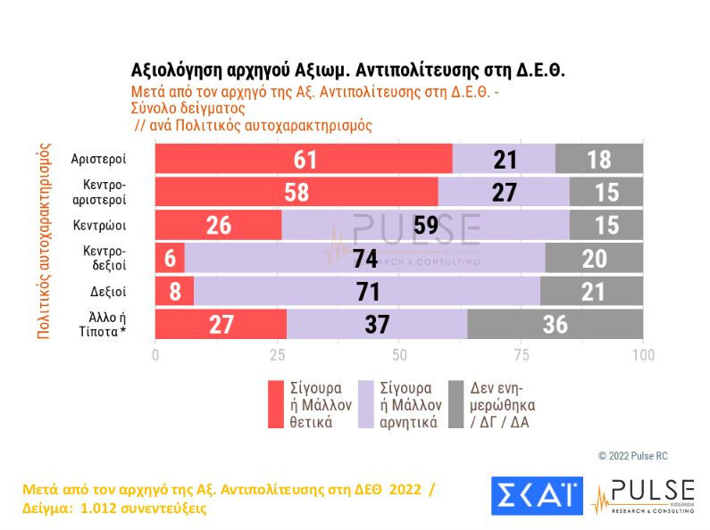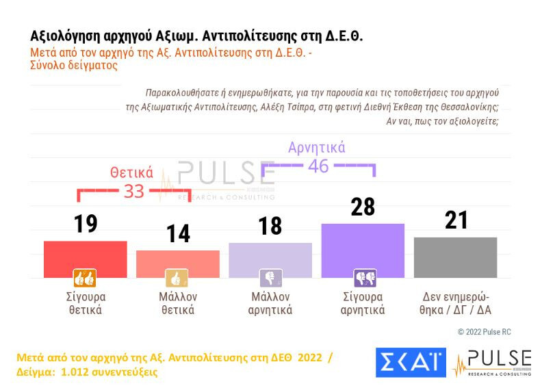 Αρνητικό είναι το ποσοστό αξιολόγησης για την παρουσία του Αλέξη Τσίπρα στη ΔΕΘ. Ο αρχηγός του κόμματος της αξιωματικής αντιπολίτευσης αξιολογήθηκε θετικά από το 33% των ερωτηθέντων, ενώ το 46% αξιολόγησε αρνητικά την παρουσία του.