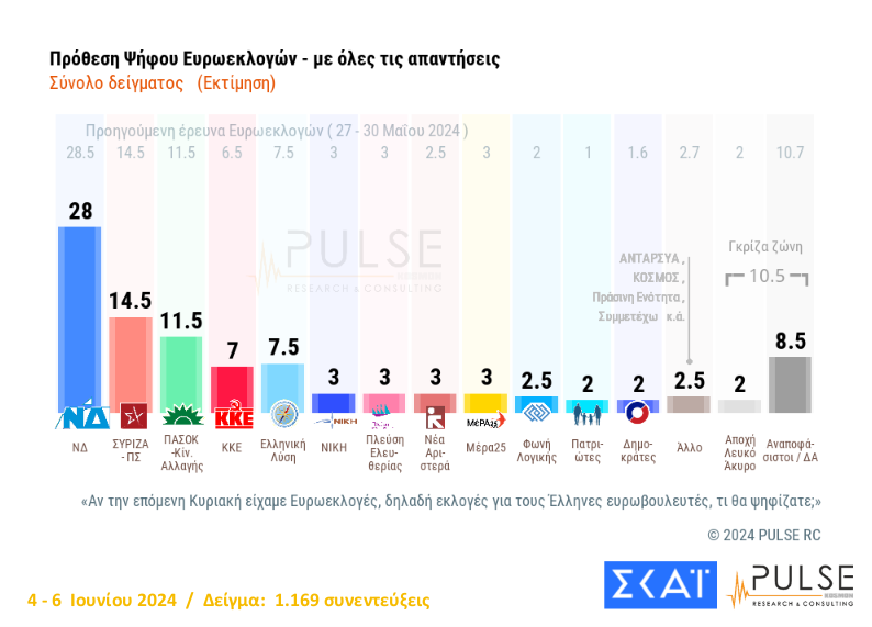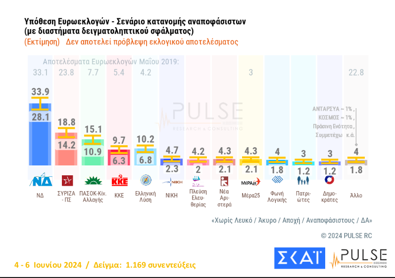 Σύμφωνα με την έρευνα της Pulse, η Νέα Δημοκρατία αναμένεται να συγκεντρώσει πσοοστό άνω του 30%, διατηρώντας τη μεγάλη διαφορά από τον ΣΥΡΙΖΑ..