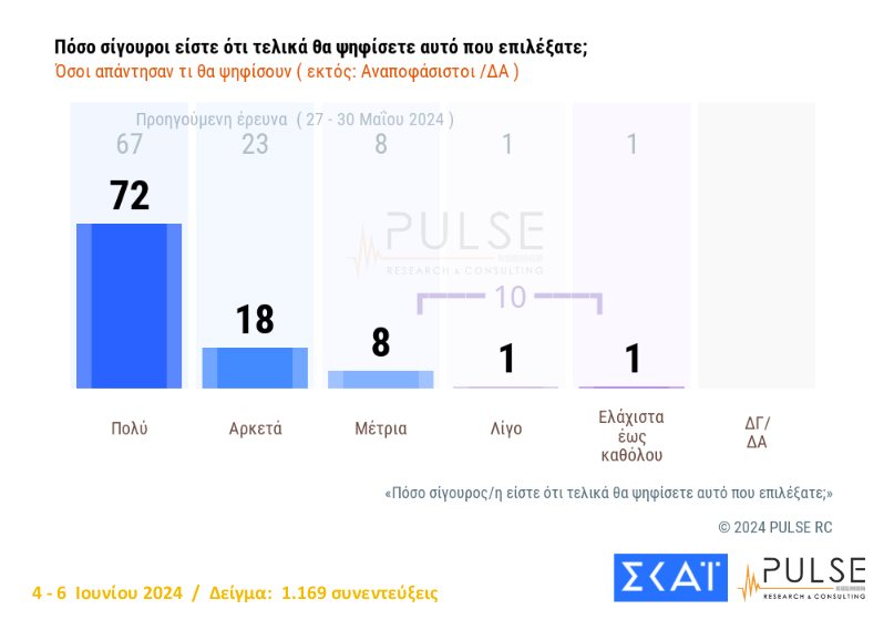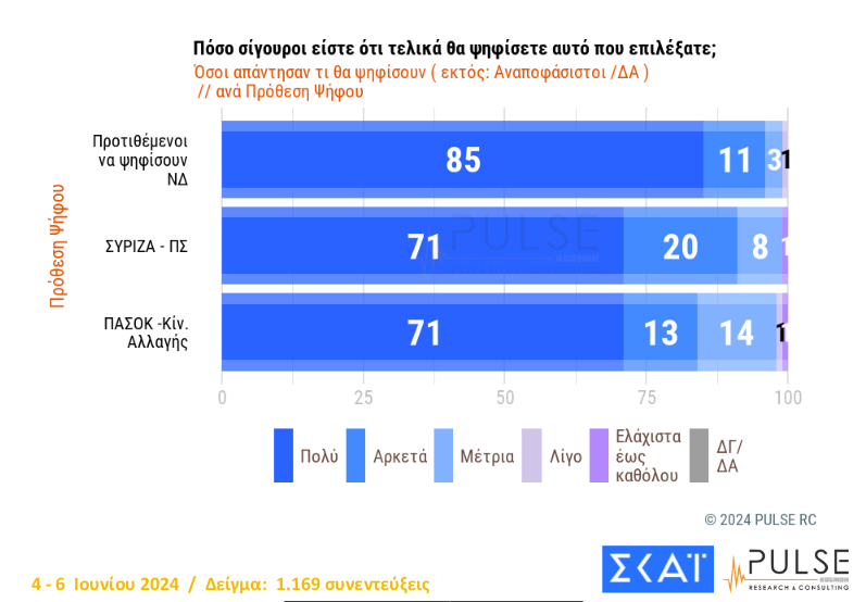 Ένας ακόμη παράγοντας που θα διαδραματίσει σημαντικό ρόλο στη διαμορφωση του αποτελέσματος των ευρωεκλογών, είναι το ποσοστό των ψηφοφόρων που δεν θα αλλάξουν την απόφασή τους. Τα στοιχεία της Pulse δίνουν μία τάξη μεγέθους, εξειδικεύοντας παράλληλα και τα πιθανά ποσοστά αποχής ανά κόμμα.