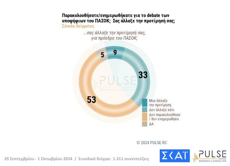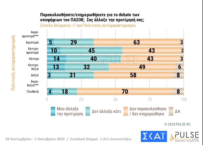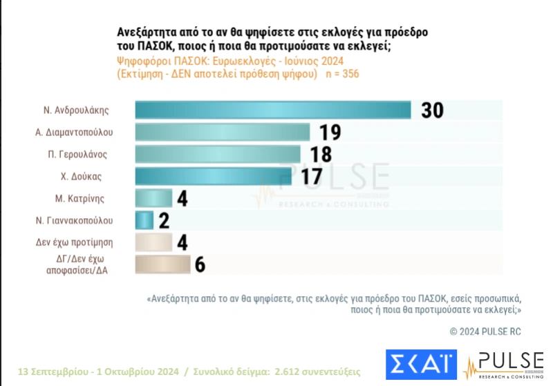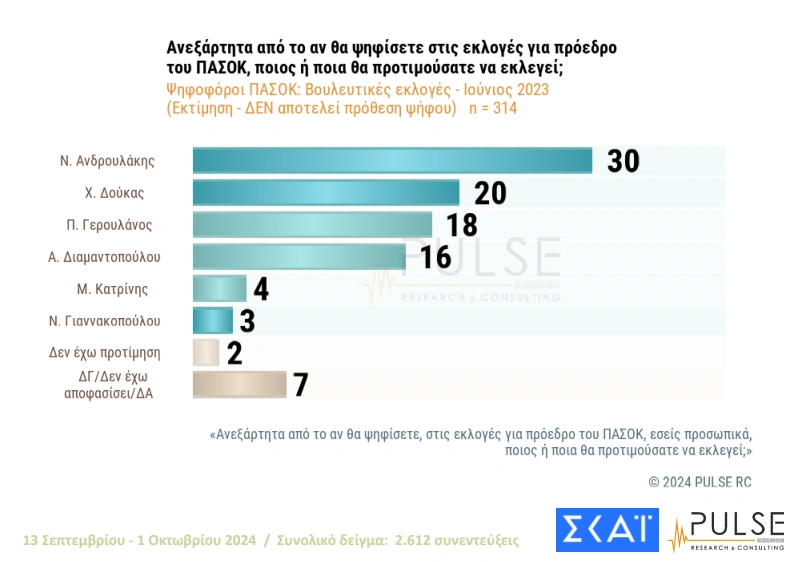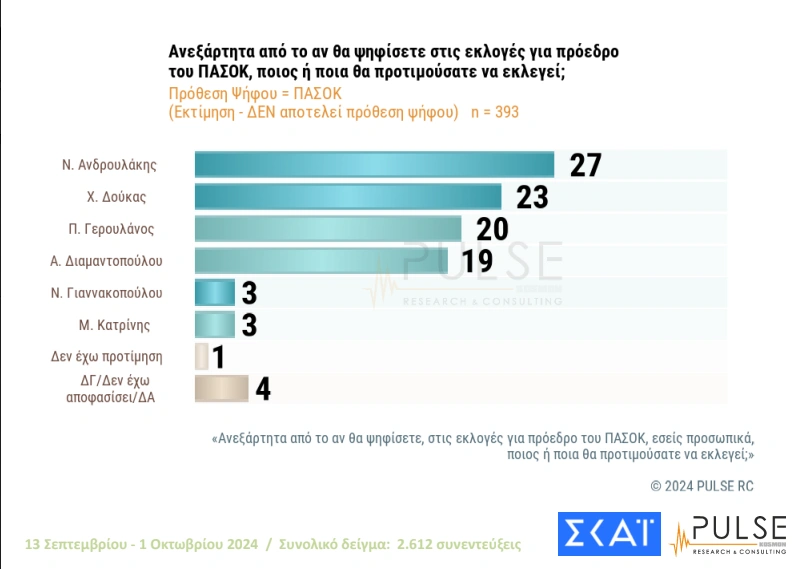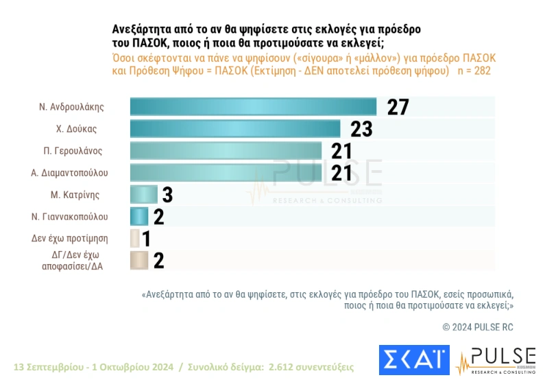 Σύμφωνα με τα στοιχεία της έρευνας, στη μάχη για την προεδρία του ΠΑΣΟΚ φαίνεται να διατηρεί το προβάδισμα ο Νίκος Ανδρουλάκης, ο οποίος δείχνει να έχει εξασφαλισμένη την πρώτη θέση και το ένα «εισιτήριο» για τον 2ο γύρο, ενώ για τη 2η θέση, θα «κονταροχτυπηθούν», σχεδόν με ίδια ποσοστά η Άννα Διαμαντοπούλου, ο Παύλος Γερουλάνος και ο Χάρης Δούκας. Όσον αφορά στο debate των υποψηφίων του ΠΑΣΟΚ και το ποσοστό στο οποίο επηρέασε τους ψηφοφόρους, ελάχιστοι ήταν εκείνοι που δήλωσαν ότι άλλαξαν την επιλογή τους.