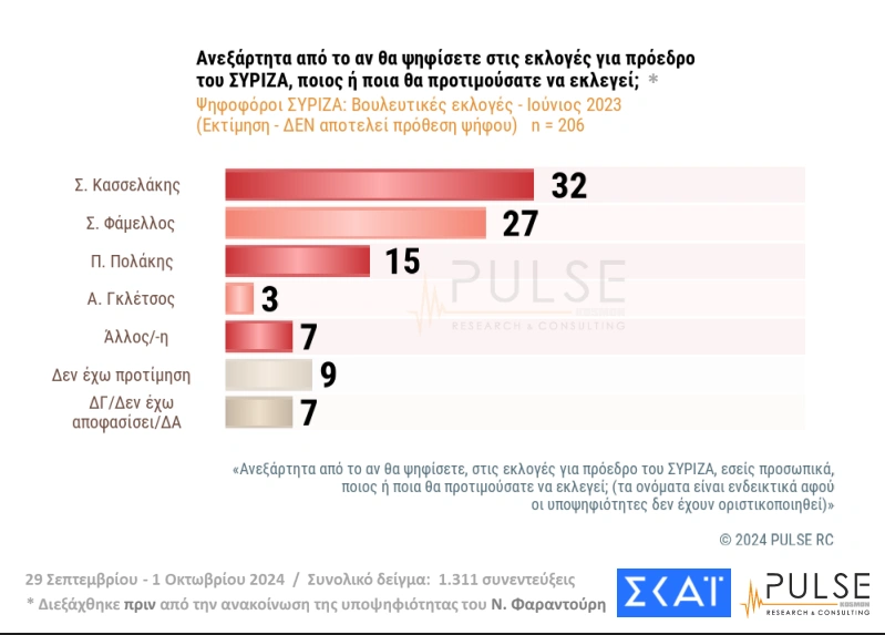 Όσον αφορά στις επικείμενες εκλογές για την προεδρία του ΣΥΡΙΖΑ, παρ’ ότι δεν έχει ολοκληρωθεί η διαδικασία δήλωσης των υποψηφιοτήτων, οι ψηφοφόροι του κόμματος της αξιωματικής αντιπολίτευσης δείχνουν να… επιμένουν στον Στέφανο Κασσελάκη, ο οποίος προηγείται με μεγάλη διαφορά από τον δεύτερο. Μεγάλη δυσαρέσκεια φαίνεται και για τις τελευταίες εξελίξεις στην Κουμουνδούρου, καθώς μόλις το 11% των ερωτηθέντων θεωρεί ότι ο ΣΥΡΙΖΑ θα έχει καλύτερο μέλλον.