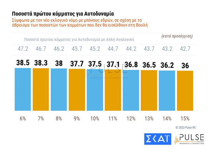 Σύμφωνα με τα ποσοστά που συγκεντρώνουν τα κόμματα με βάση τη δημοσκόπηση της Pulse, ο αριθμός των κομμάτων που θα εξασφαλίσουν την είσοδό τους στη Βουλή διαβαθμίζεται από τον ρυθμιστικό ρόλο που είχε στην απλή αναλογική και γίνεται καθοριστικός για την επίτευξη του στόχου της αυτοδυναμίας.