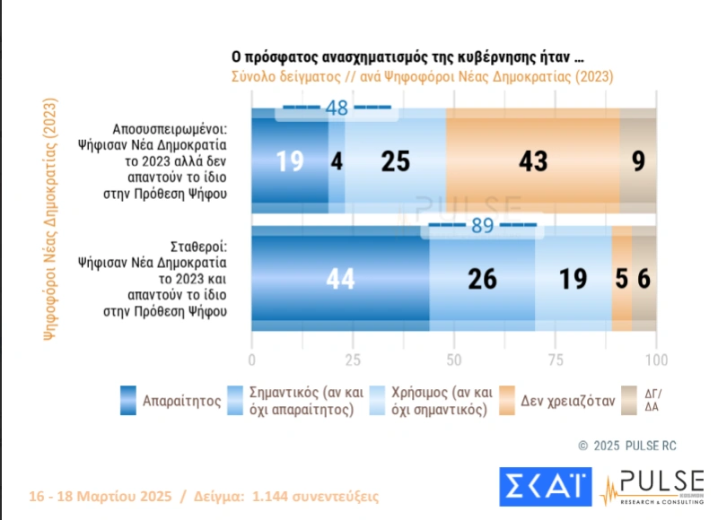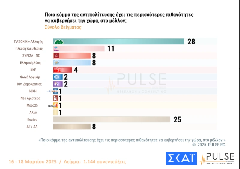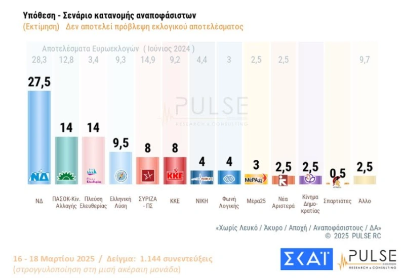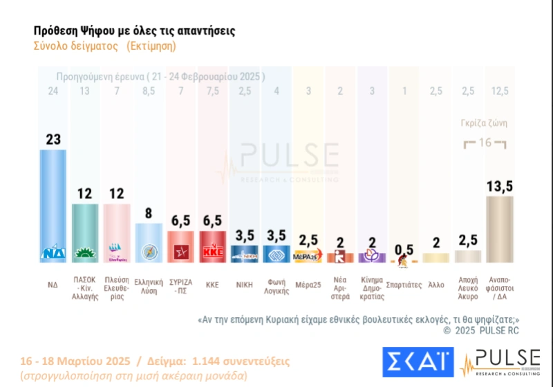 Η μεγάλη δημοσκόπηση του ΣΚΑΪ, την οποία διεξήγαγε η εταιρεία Pulse και παρουσιάστηκε στο κεντρικό δελτίο ειδήσεων του σταθμού με τη Σία Κοσιώνη, επιβεβαίωσε το νέο πολιτικό σκηνικό που δείχνει να διαμορφώνεται, με τη Νέα Δημοκρατία να παραμένει πρώτο κόμμα και την Πλεύση Ελευθερίας να διεκδικεί ανοιχτά τη δεύτερη θέση, την οποία μοιράζεται με το ΠΑΣΟΚ. Στην 4η θέση ακολουθεί η Ελληνική Λύση, ενώ ο ΣΥΡΙΖΑ φαίνεται να παρουσιάζει μία ελαφριά ανάκαμψη στα ποσοστά του., φτάνοντας το ΚΚΕ.