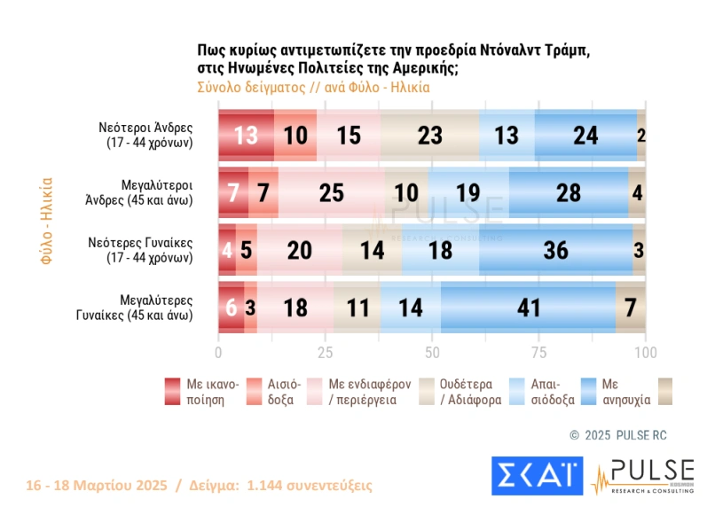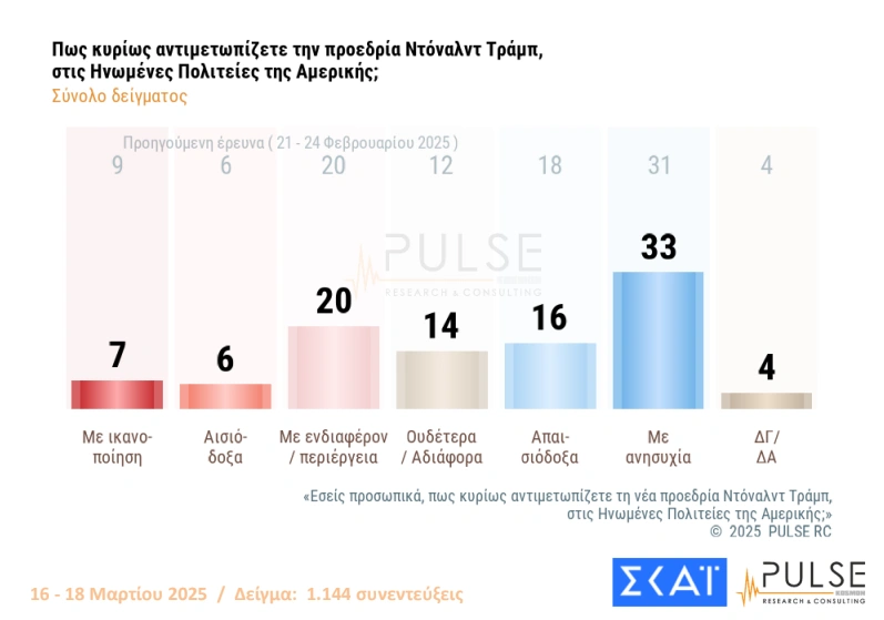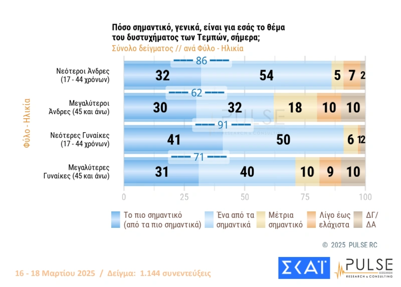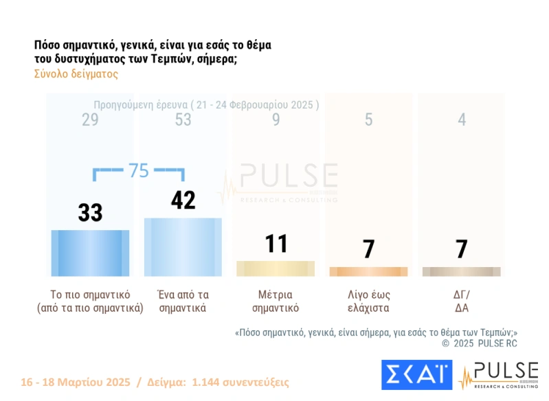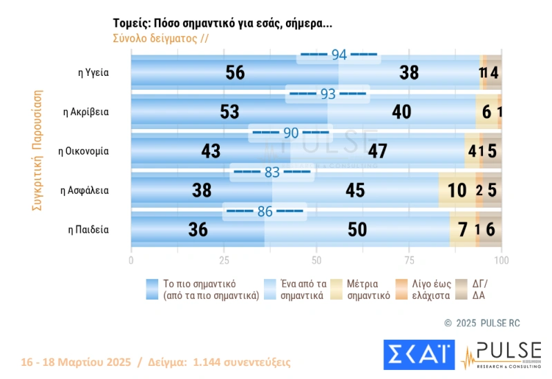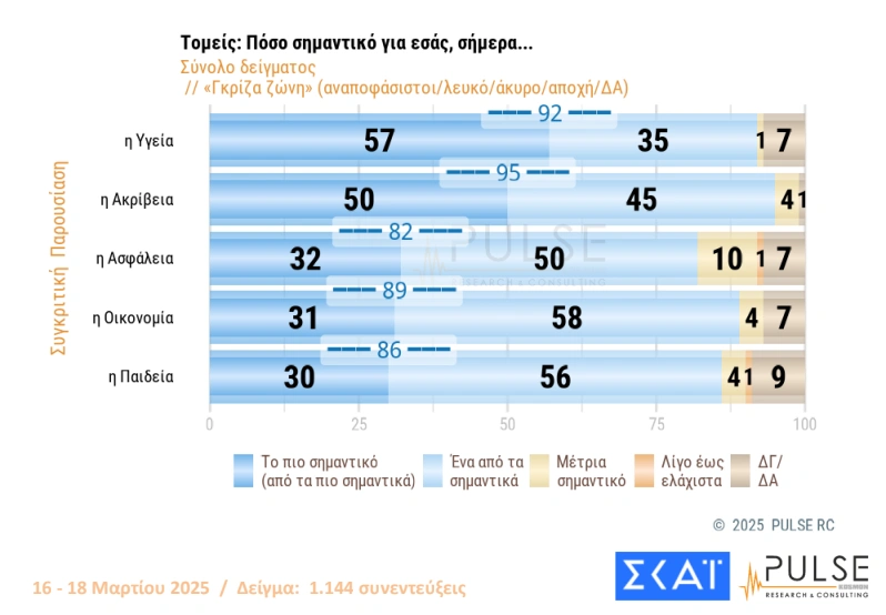 Στην ερώτηση για το πόσο σημαντική είναι η υπόθεση των Τεμπών, η συντριπτική πλειοψηφία απάντησε «ναι». Η ακρίβεια-οικονομικά και η υγεία παραμένουν τα δύο βασικά θέματα που απασχολούν τους Έλληνες πολίτες, με ποσοστά άνω του 90%, δηλαδή σχεδόν τους πάντες. Η δημοσκόπηση της Pulse συμπεριέλαβε στο ερωτηματολόγιό της και τα μέχρι στιγμής δείγματα της προεδρίας του Ντόναλντ Τραμπ, ο οποίος, με τις αποφάσεις του, επανακαθορίζει τις ισορροπίες σε παγκόσμιο επίπεδο.