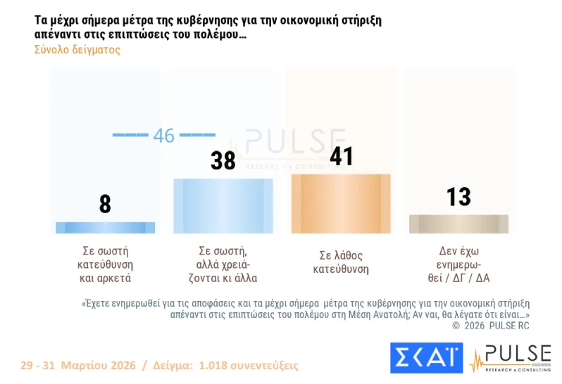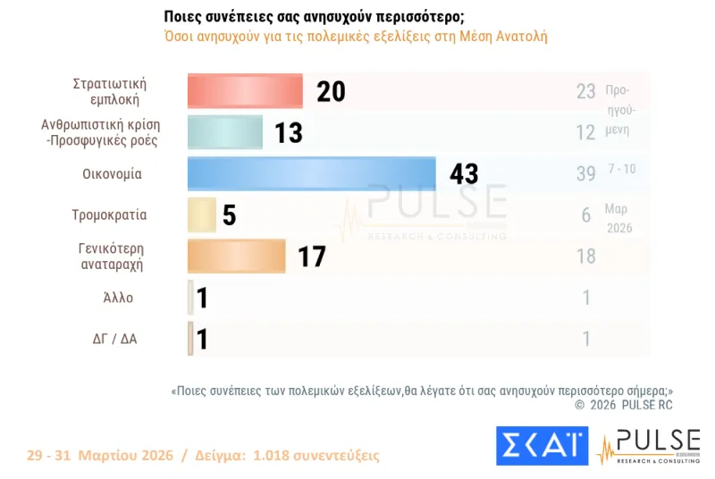 Η δημοσκόπηση της Pulse ασχολείται ιδιαίτερα με τις συνέπειες της Κρίσης στη Μέση Ανατολή. Η βασική ανησυχία των πολιτών αφορά για μία ακόμη φορά τα οικονομικά. Όσον αφορά στα μέτρα που έχει ανακοινώσει η κυβέρνηση, οι πολίτες σε ένα σημαντικό πσσοστό θεωρούν ότι είναι προς τη σωστή κατεύθυνση, ωστόσο, οι περισσότεροι τα αξιολογούν ως ανεπαρκή για να καλύψουν τις συνέπειες.