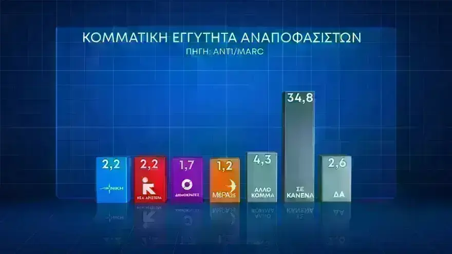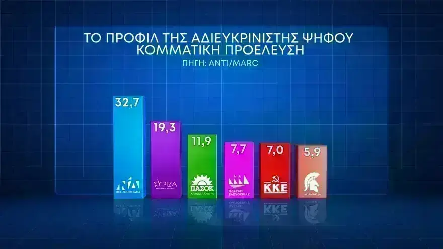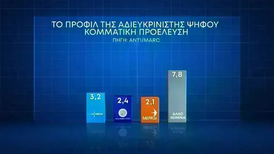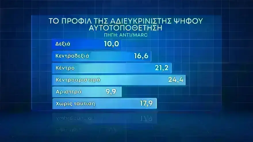 Πρώτη δύναμη στους αναποφάσιστους είναι η ΝΔ καθώς η «κομματική εγγύτητα» με το κυβερνών κόμμα είναι στο 16,1%.