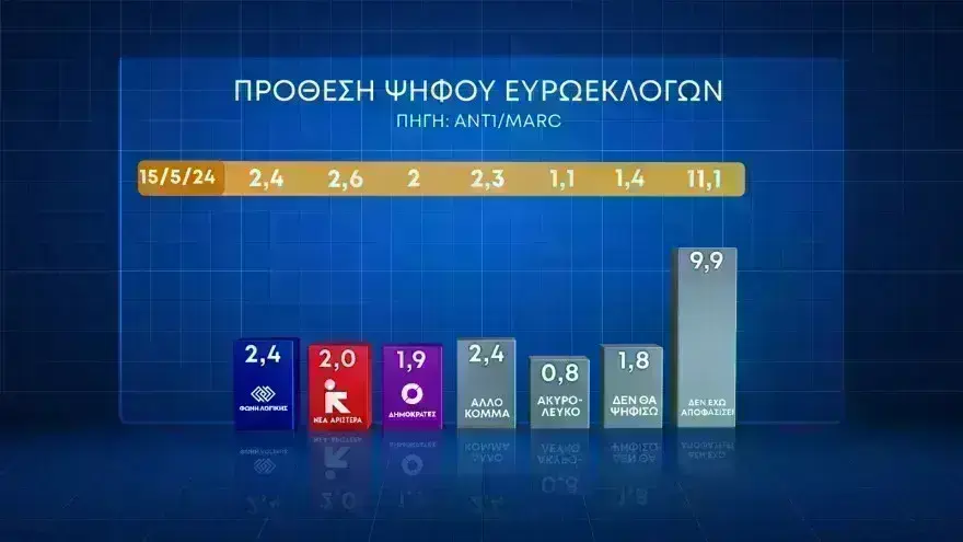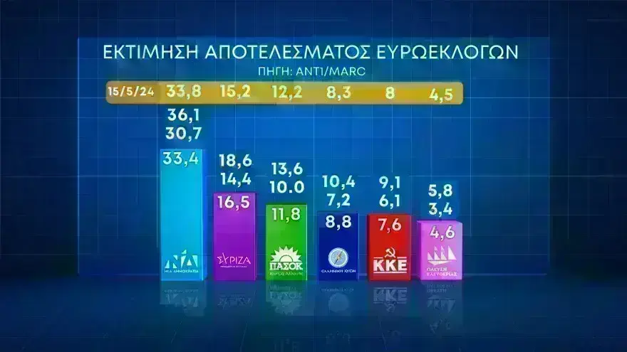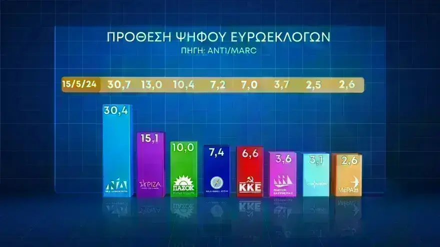 Σαφές προβάδισμα 16,5 μονάδων στην πρόθεση ψήφου καταγράφει η Νέα Δημοκρατία έναντι του ΣΥΡΙΖΑ σε νέα δημοσκόπηση της MARC για λογαριασμό του τηλεοπτικού σταθμού ΑΝΤ1, πριν από τις ευρωεκλογές 2024.