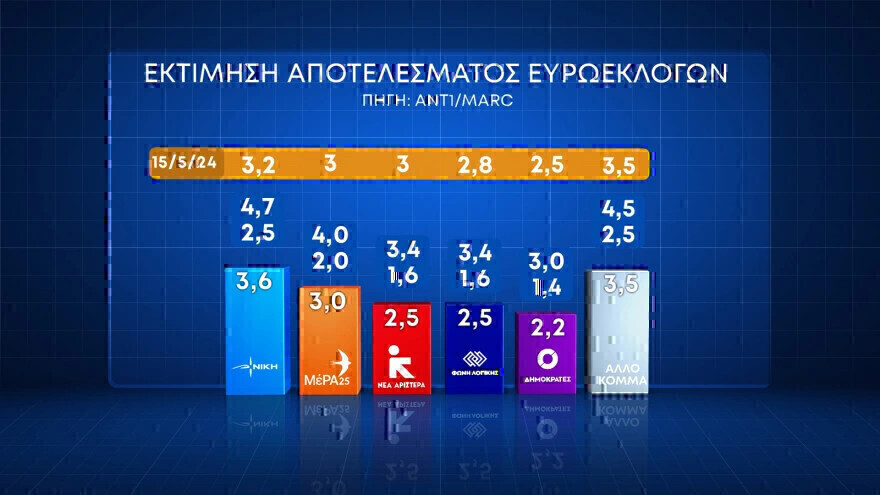 Το βασικό σενάριο για τις 21 ελληνικές έδρες προβλέπει τη Νέα Δημοκρατία με 7 εκπροσώπους, τον ΣΥΡΙΖΑ με 4, το ΠΑΣΟΚ με 3, το ΚΚΕ και την Ελληνική Λύση απο 2 και Νίκη, Πλεύση Ελευθερίας και ΜέΡΑ25 από μία. Η Νέα Αριστερά, που βρίσκεται μεν στο όριο του 3%, μένει χωρίς βουλευτή.