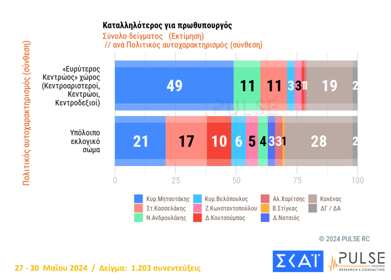 Όσον αφορά στη γνώμη των πολιτών για τον καταλληλότερο πρωθυπουργός, ο Κυριάκος Μητσοτάκης παραμένει με μεγάλη διαφορά στην πρώτη θέση. Δεύτερος έρχειαι ο… κανένας και τρίτος ο Στέφανος Κασσελάκης. Με μονοψήφια ποσοστά ακολουθούν ο Νίκος Ανδρουλάκης και ο Δημήτρης Κουτσούμπας, με τον Κυριάκο Βελόπουλο.