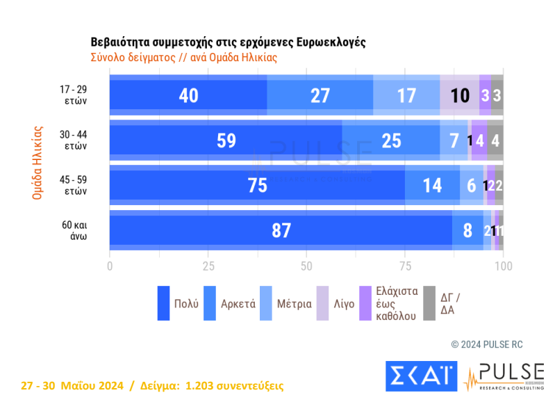 Η έρευνα της Pulse δείχνει ότι η διάθεση συμμετοχής αυξάνεται με την ηλικία, καθώς οι μεγαλύτεροι δηλώνουν ότι θα σπεύσουν να ασκήσουν το εκλογικό τους καθήκον, σε αντίθεση με τους νεώτερους, οι οποίοι μάλλον θα προτιμήσουν τις… παραλίες.
