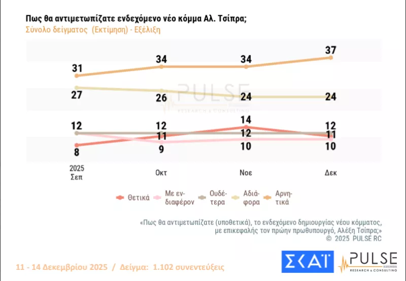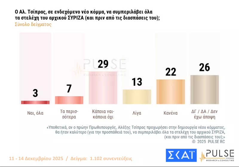 Η Pulse δεν μετρά ακόμη πιθανό φορέα της Μαρίας Καρυστιανού, εξετάζει όμως τα σενάρια δημιουργίας κομμάτων από τους πρώην πρωθυπουργούς Αλέξη Τσίπρα και Αντώνη Σαμαρά. Το ενδεχόμενο κόμμα Τσίπρα, αν και εμφανίζει πτώση σε σχέση με προηγούμενη μέτρηση, συγκεντρώνει θετικές ή ενδιαφέρουσες γνώμες από το 21% των ερωτηθέντων, ενώ ένα επιπλέον 12% τοποθετείται ουδέτερα. Αντίθετα, το σενάριο κόμματος Σαμαρά φαίνεται να έχει μικρότερη δυναμική, με το βασικό ερώτημα να αφορά το κατά πόσο θα αποσπάσει ψηφοφόρους από τη Νέα Δημοκρατία.