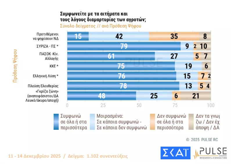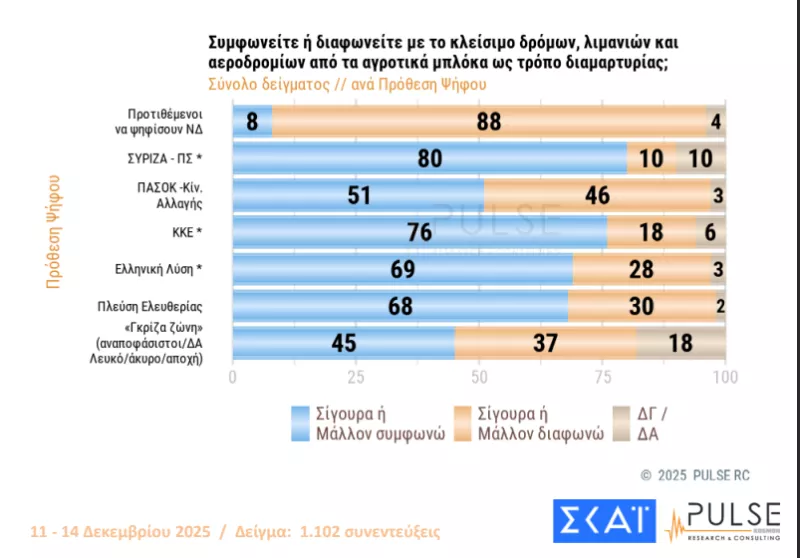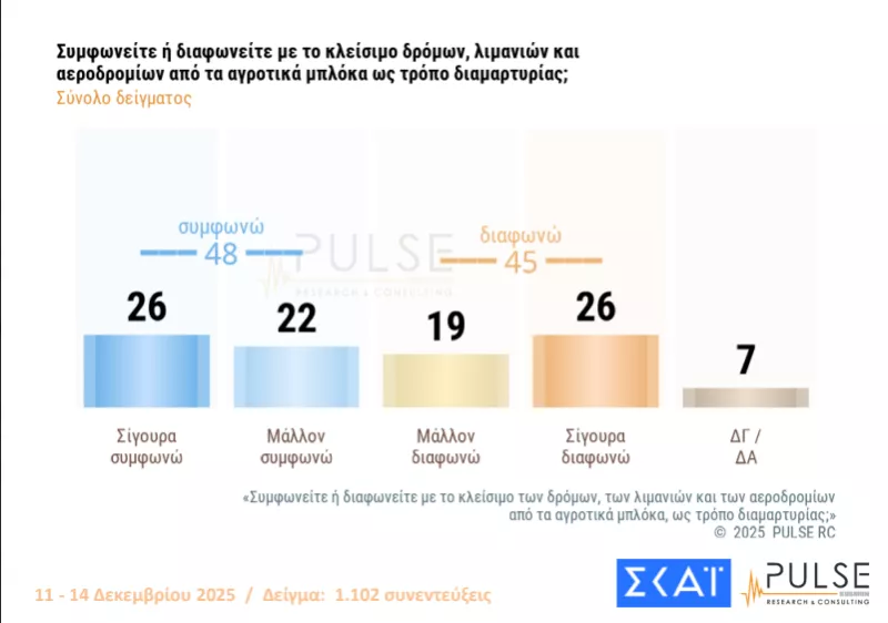 Σε ό,τι αφορά το Αγροτικό ζήτημα, η πλειοψηφία των πολιτών δηλώνει ότι στηρίζει τα αιτήματα των αγροτών. Ωστόσο, οι απόψεις διχάζονται όταν πρόκειται για τις μορφές κινητοποιήσεων, όπως το κλείσιμο δρόμων, λιμανιών και αεροδρομίων, όπου τα ποσοστά στήριξης και αντίθεσης εμφανίζονται σχεδόν ισομερώς κατανεμημένα.