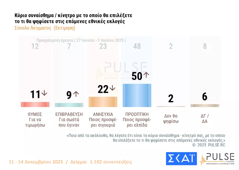 Στη θέση του έχει αναδειχθεί η ανάγκη για προοπτική και ελπίδα, με τους πολίτες να στρέφονται περισσότερο σε προτάσεις που υπόσχονται βελτίωση της καθημερινότητας. Αντί να επιλέγουν με γνώμονα την τιμωρία, αξιολογούν προγράμματα και αναζητούν ρεαλιστικές λύσεις. Υποσχέσεις χωρίς ουσιαστικό περιεχόμενο φαίνεται να μην πείθουν, καθώς τόσο όσοι έζησαν την περίοδο των μνημονίων όσο και οι νεότερες γενιές δίνουν πλέον έμφαση στην αξιοπιστία, τον σχεδιασμό και ένα πειστικό όραμα για το μέλλον.