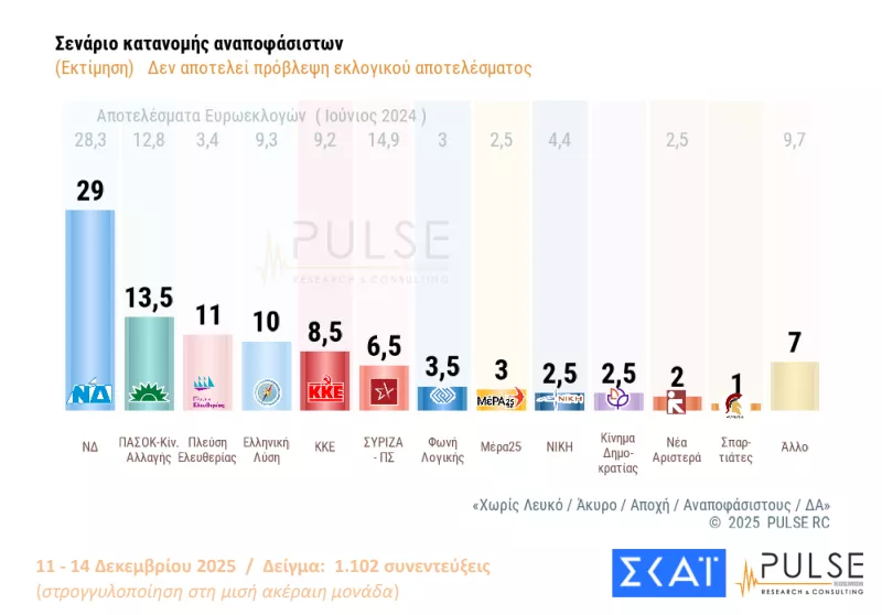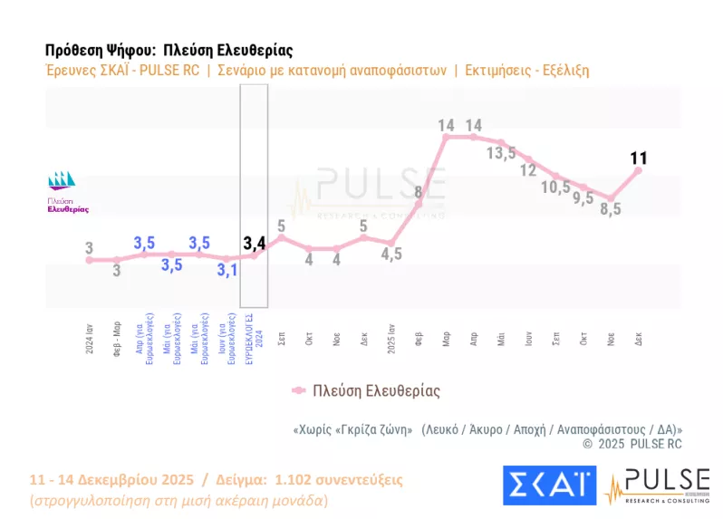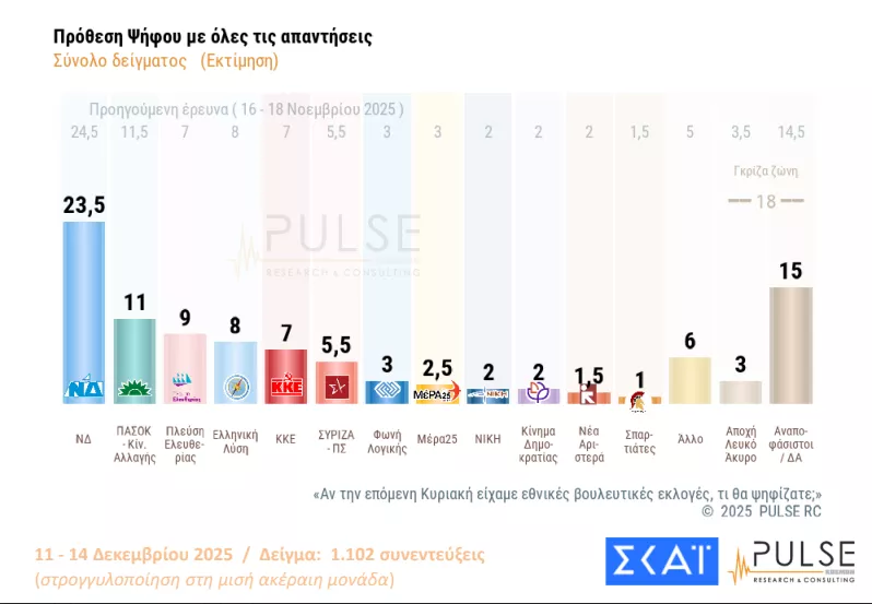 Μικρή υποχώρηση καταγράφει η Νέα Δημοκρατία στην πρόθεση ψήφου, καθώς σύμφωνα με τη δημοσκόπηση της Pulse εμφανίζεται μειωμένη κατά μία ποσοστιαία μονάδα σε σχέση με τον Νοέμβριο. Παρά τη φθορά αυτή, το κυβερνών κόμμα διατηρεί σε γενικές γραμμές τις δυνάμεις του, ακόμη και μέσα σε ένα περιβάλλον έντονης πίεσης, με τις αγροτικές κινητοποιήσεις να συνεχίζονται για τρίτη εβδομάδα και την υπόθεση του ΟΠΕΚΕΠΕ να παραμένει ανοιχτή.