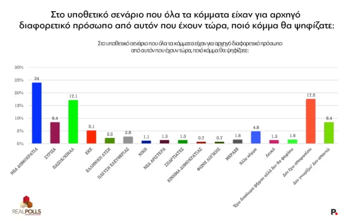 Σχετικά με την πρόθεση ψήφου σε υποθετικά σενάρια αλλαγής ηγεσίας στα κόμματα: Η Νέα Δημοκρατία διατηρεί μεν την πρωτοκαθεδρία, ωστόσο χωρίς τον Κυριάκο Μητσοτάκη υποχωρεί σημαντικά στο 24%. Αντίθετα, ένα ΠΑΣΟΚ χωρίς τον Νίκο Ανδρουλάκη φαίνεται να ενισχύεται εντυπωσιακά, φτάνοντας το 17,1%.
