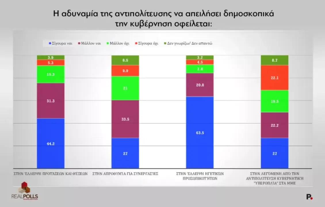 Στο καίριο ερώτημα για τους λόγους της αδυναμίας της αντιπολίτευσης να ασκήσει ουσιαστική πίεση στην κυβέρνηση, η πλειοψηφία (63,5%) αποδίδει το φαινόμενο στην έλλειψη ισχυρών ηγετικών φυσιογνωμιών. Το 44,2% επισημαίνει την απουσία προγραμματικών προτάσεων, ενώ 27% αναφέρονται τόσο στην απροθυμία για συνεργασίες όσο και στην επικοινωνιακή υπεροχή της κυβέρνησης στα μέσα ενημέρωσης.