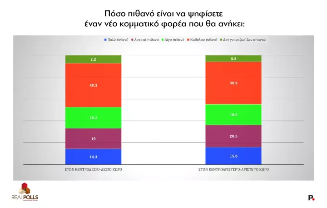 Παράλληλα, το 33% περίπου των συμμετεχόντων στην έρευνα δηλώνει ότι είναι πολύ ή αρκετά πιθανό να στηρίξει ένα νέο κόμμα που θα τοποθετείται στα δεξιά ή κεντροδεξιά του πολιτικού φάσματος. Αντίστοιχα, το 36% εμφανίζεται δεκτικό στην προοπτική ενός νέου πολιτικού φορέα στα αριστερά ή κεντροαριστερά.