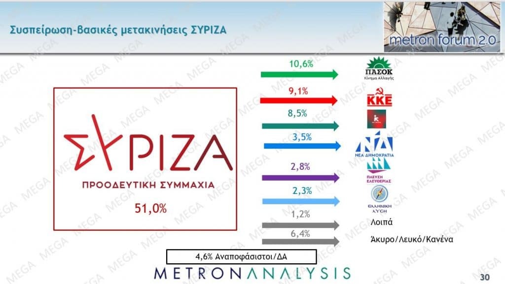 Η δημοσκόπηση δείχνει ότι ύστερα από την παραίτηση Τσίπρα, την εκλογή του Στέφανου Κασσελάκη και τη διάσπαση με την αποχώρηση μεγάλου αριθμού στελεχών και τη δημιουργία της Νέας Αριστεράς, έχει και μεγάλη διαρροή ψηφοφόρων προς πλήθος κατευθύνσεις.