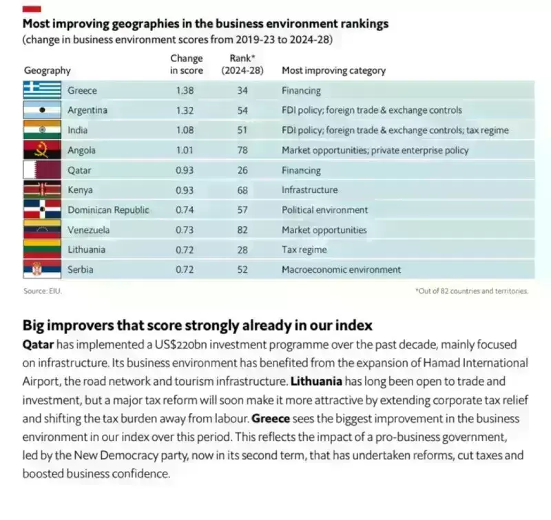 Η Ελλάδα καταγράφει τη μεγαλύτερη βελτίωση στο επιχειρηματικό περιβάλλον μεταξύ 82 χωρών σε παγκόσμιο επίπεδο, σύμφωνα με τον δείκτη business environment index της Μονάδας Μελετών και Ανάλυσης (Economist Intelligence Unit – EIU) για την περίοδο 2024-28.