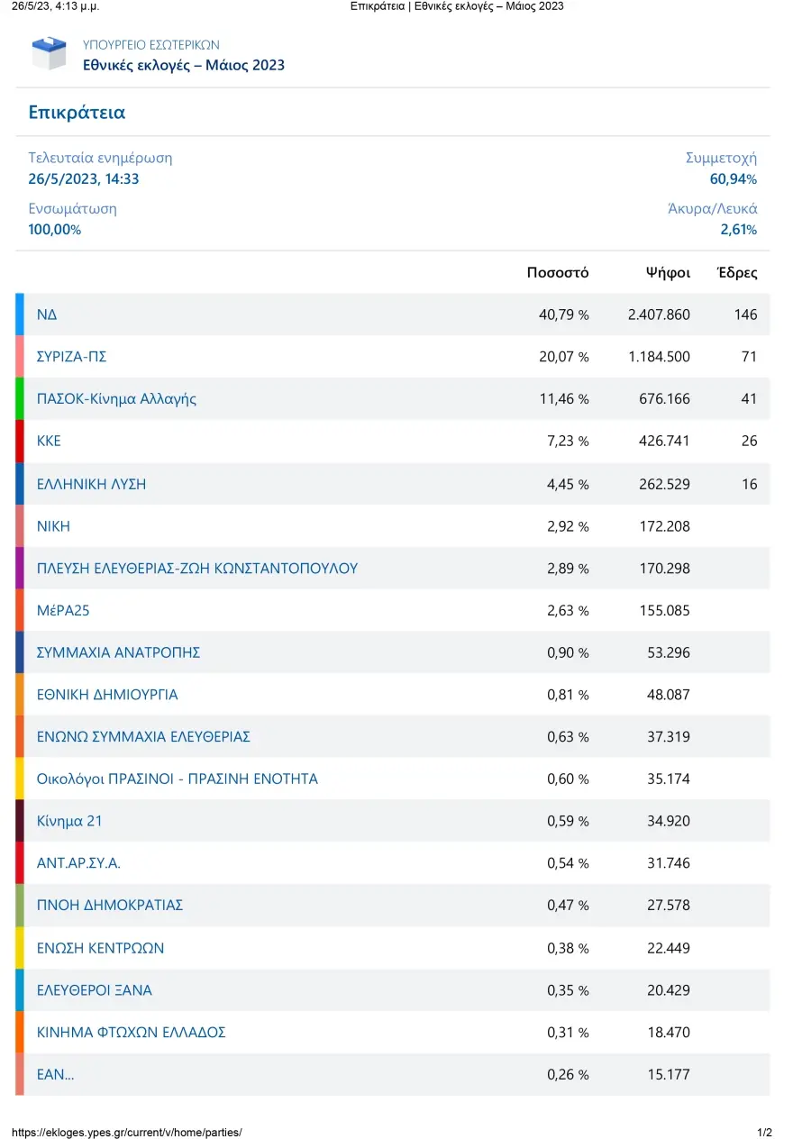 Στις εκλογές 2023, οι οποίες διεξήχθησαν με απλή αναλογική, η ΝΔ εξασφάλισε μια νίκη με διαστάσεις θριάμβου, με τον χάρτη της Ελλάδας να βάφεται μπλε, καθώς η διαφορά έφτασε τις 20,72 ποσοστιαίες μονάδες. Τα αποτελέσματα δίνουν πεντακομματική Βουλή με ΝΔ, ΣΥΡΙΖΑ, ΠΑΣΟΚ, ΚΚΕ και Ελληνική Λύση, η οποία θα ορκιστεί το απόγευμα της ερχόμενης Κυριακής και στη συνέχεια θα διαλυθεί τη Δευτέρα προκειμένου να προκηρυχθούν οι επόμενες εκλογές με ενισχυμένη αναλογική στις 25 Ιουνίου.