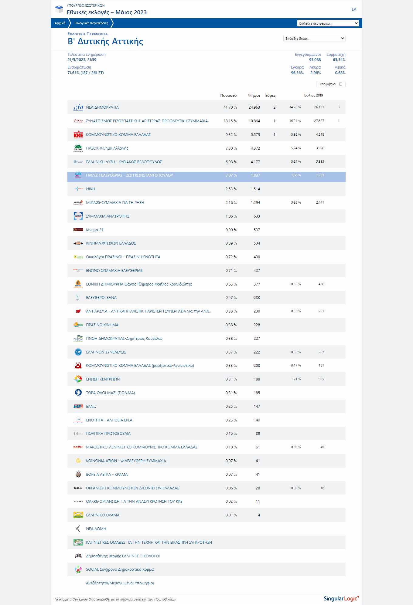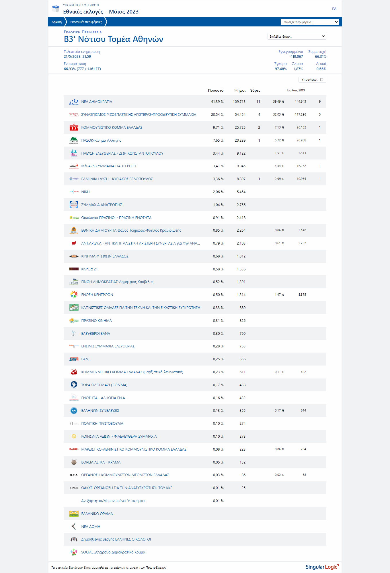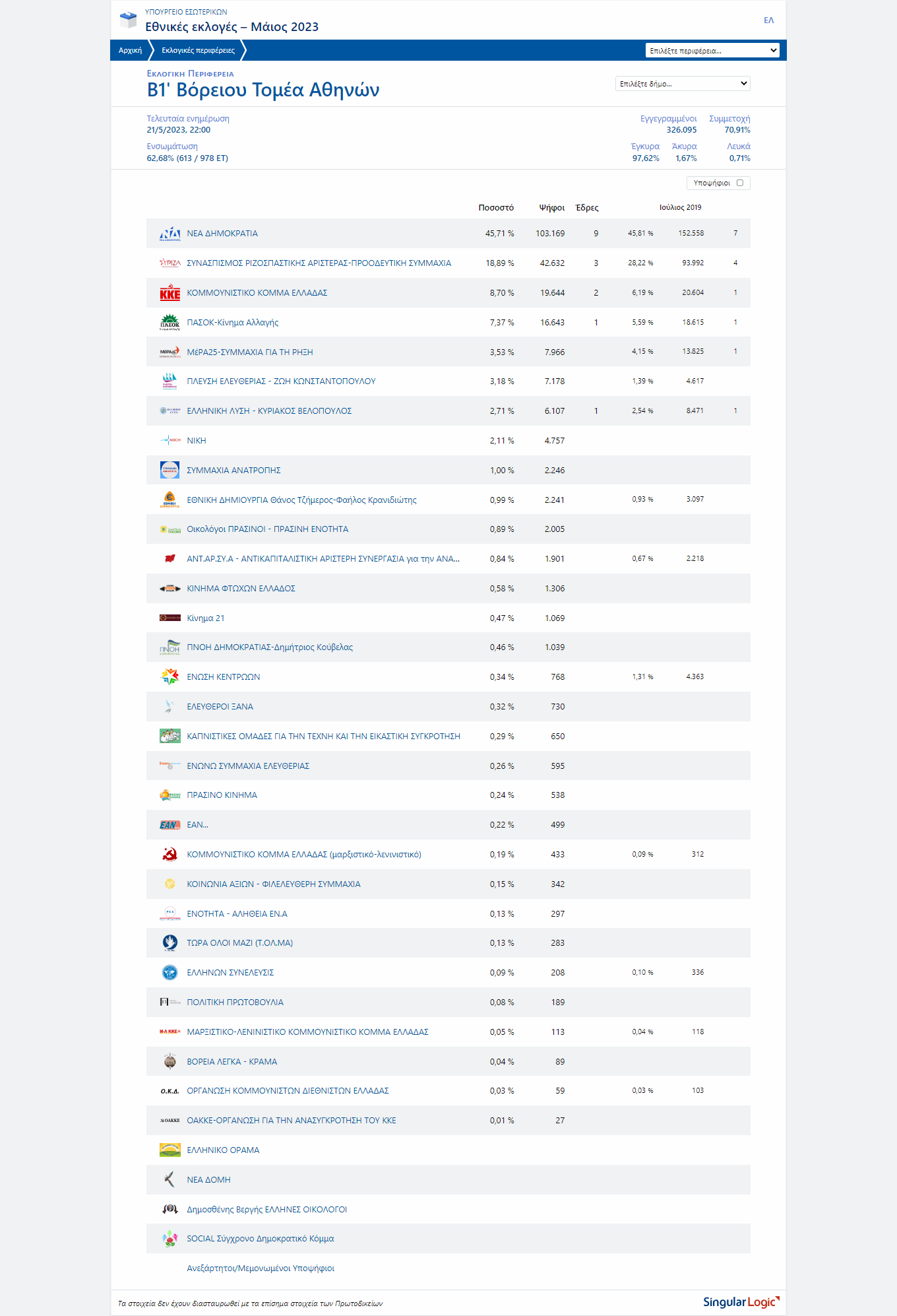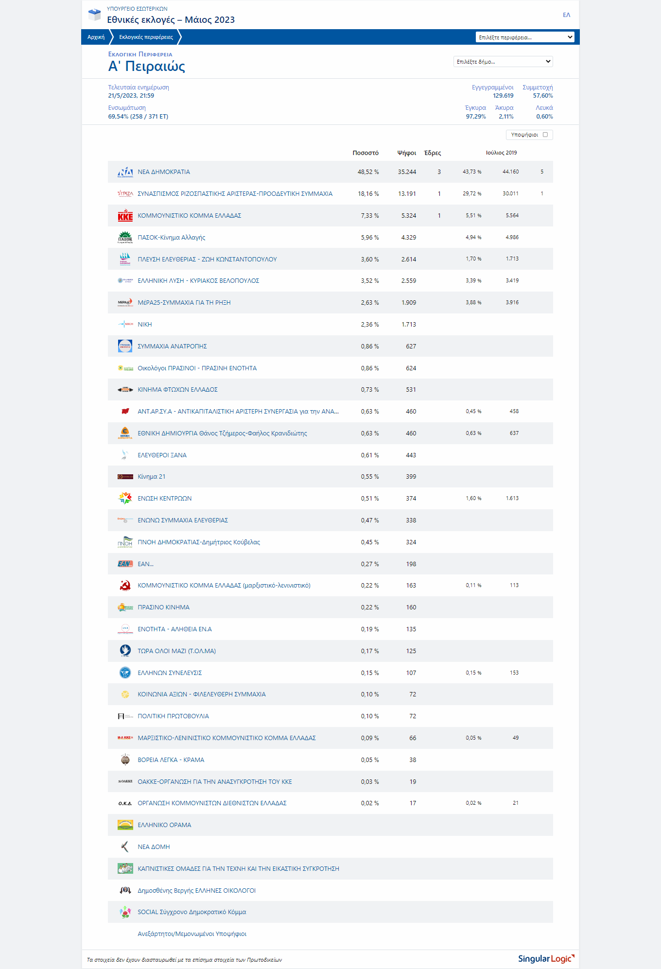 Το κόμμα του Κυριάκου Μητσοτάκη συγκεντρώνει ποσοστό 40,87%, ποσοστό που είναι υπερδιπλάσιο του ΣΥΡΙΖΑ τα ποσοστά του οποίου καταρρέουν στο 20,09%. Τρίτη εκλογική δύναμη αναδεικνεύται το ΠΑΣΟΚ/Κίνημα Αλλαγής με ποσοστό 11,92%, ακολουθεί το ΚΚΕ με 7,05% και η Ελληνική Λύση με 4,49%.