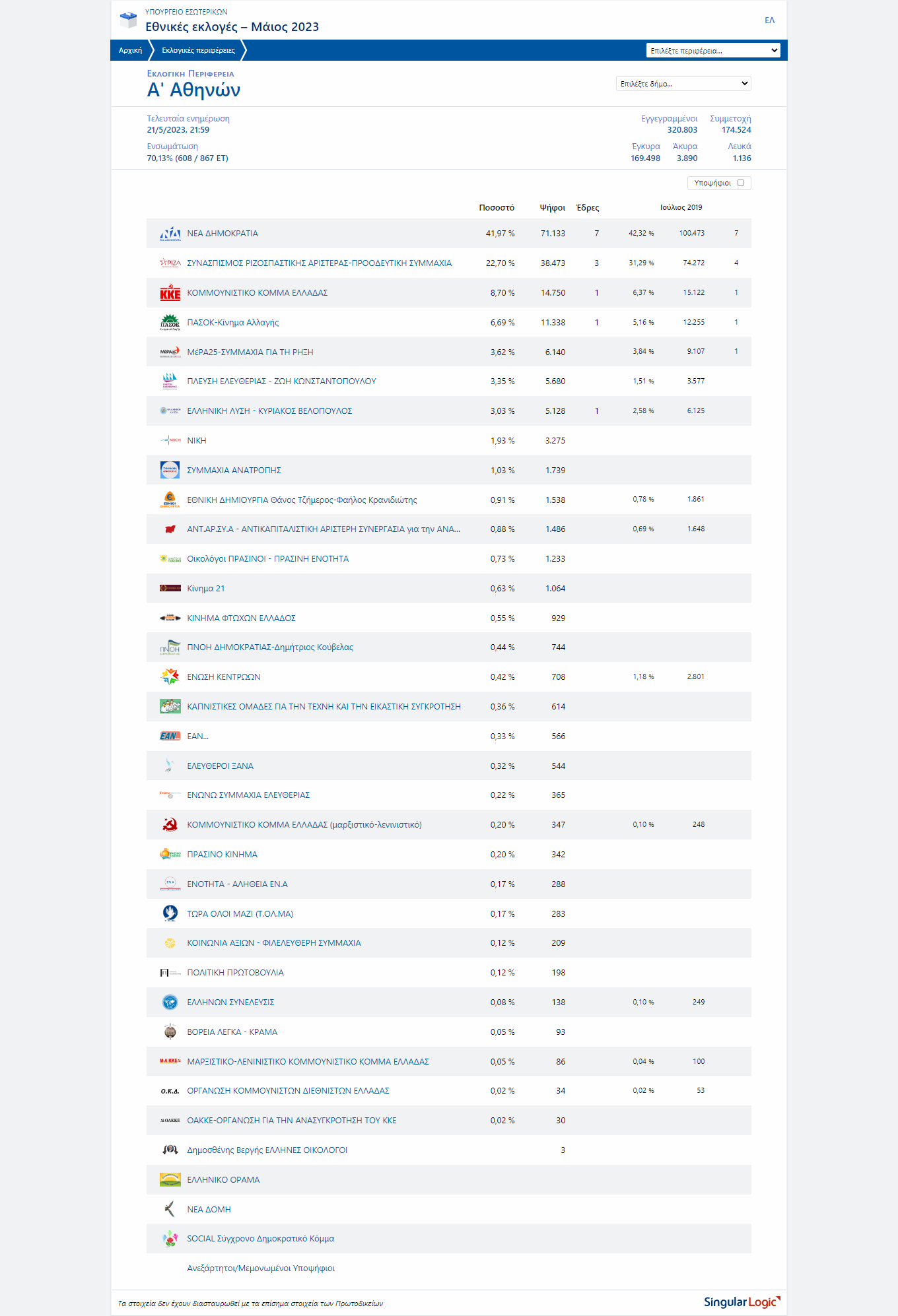 Ξεκινώντας από την Α’ Αθηνών και σε ενσωμάτων 70.13 % (608 / 867 ΕΤ), είναι πρώτη η Νέα Δημοκρατία με ποσοστό 41,97% με τον ΣΥΡΙΖΑ να ακολουθεί με 22,70%.