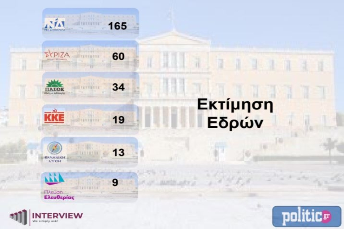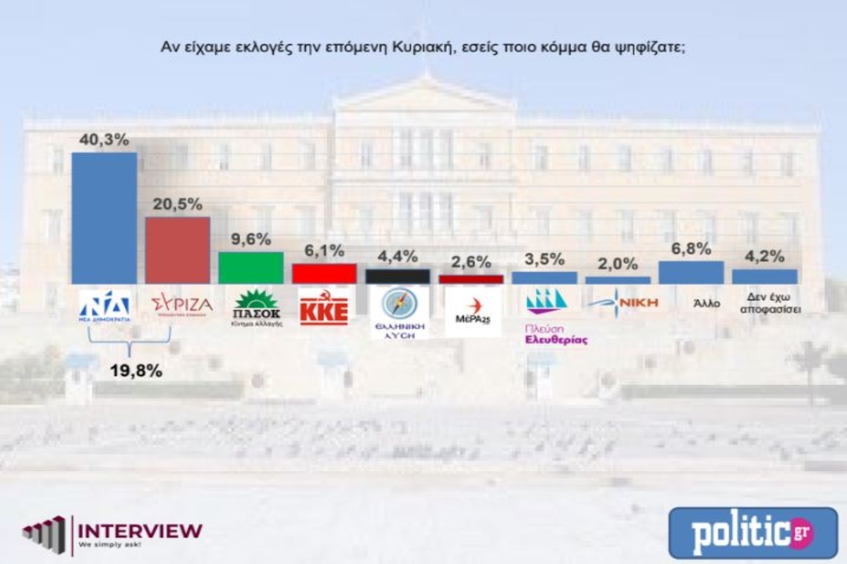 Η Νέα Δημοκρατία εξακολουθεί να προηγείται με διαφορά περίπου ίδια σε σχέση με αυτή των εκλογών της 21ης Μαΐου, αφού είναι στην πρώτη θέση με «αέρα» 19,8 μονάδων, όπως δείχνει δημοσκόπηση της Interview για την POLITIC.