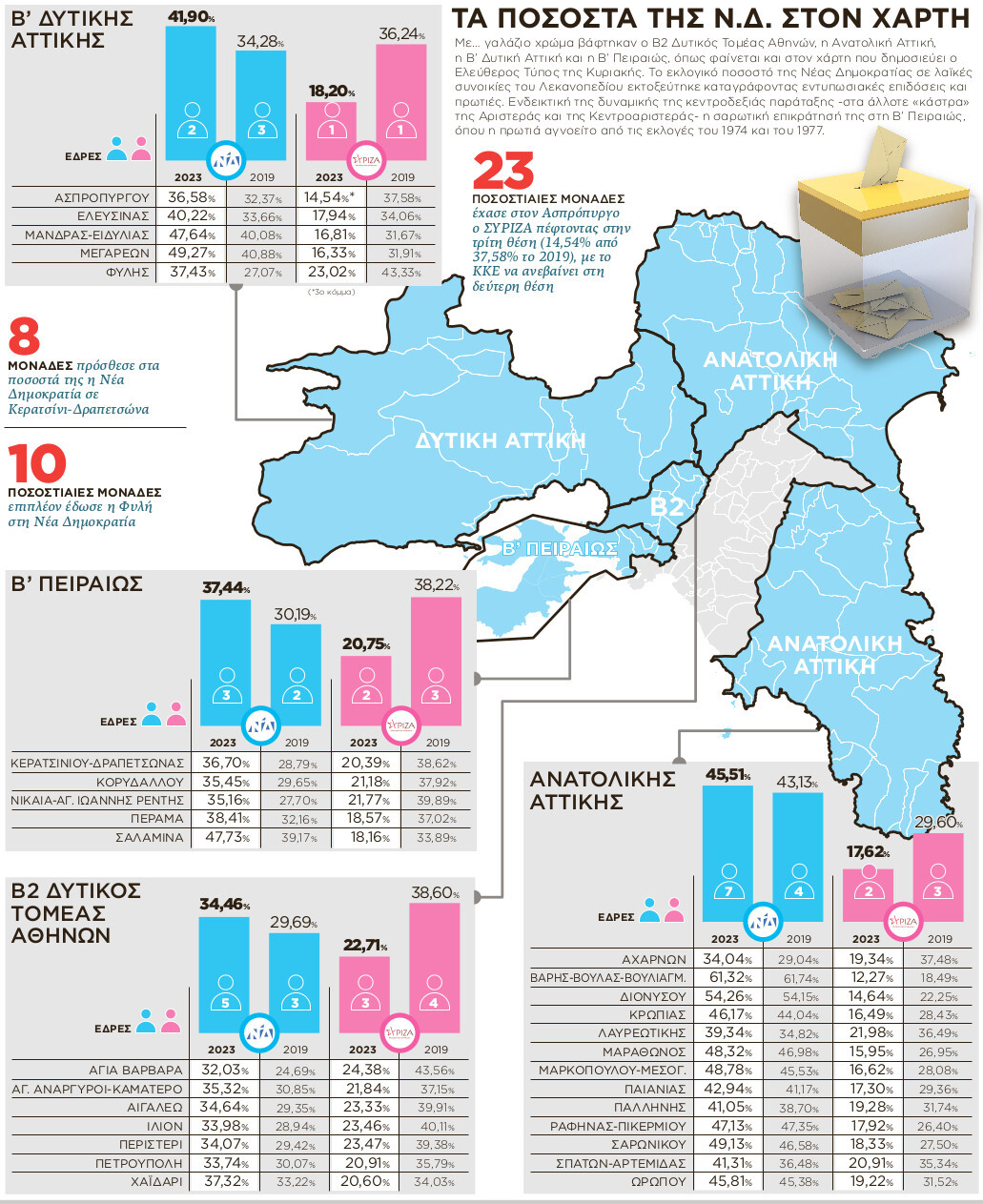 Παραδοσιακά «δύσκολες» εκλογικές περιφέρειες, όπως η Β2 Δυτικού Τομέα, η Ανατολική Αττική, η Β’ Πειραιώς και η Β’ Δυτικής Αττικής, βάφτηκαν… γαλάζιες, χαρίζοντας στο κυβερνών κόμμα μια ξεκάθαρη, μεγάλη πρωτιά. Η εντυπωσιακότερη πορεία καταγράφηκε στη Β’ Δυτικής Αττικής, (Ασπρόπυργος, Ελευσίνα, Μάνδρα, Μέγαρα, Φυλή), όπου το εκλογικό ποσοστό της Ν.Δ. εκτοξεύτηκε από το 34,28% των προηγούμενων εκλογών στο 41,90% (+7,62%), ποσοστό που δεν είχε πιάσει ποτέ ο ΣΥΡΙΖΑ (36,24% είχε το 2019 και έπεσε στο 18,20%). Μάλιστα, στον Ασπρόπυργο ο ΣΥΡΙΖΑ έχασε 23 ολόκληρες μονάδες και έπεσε στην τρίτη θέση (με 14,54% από 37,58%), με το ΚΚΕ να ανεβαίνει στη δεύτερη θέση.