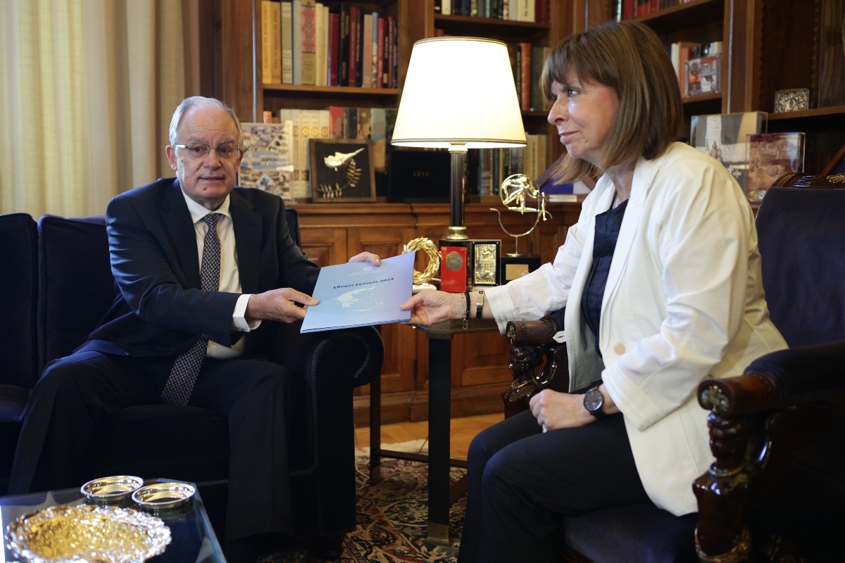 Ο Κωνσταντίνος Τασούλας πήρε τα αποτελέσματα για τις εκλογές από την υπηρεσιακή υπουργό Εσωτερικών Καλλιόπη Σπανού και με τη σειρά του ενημέρωσε την Κατερίνα Σακελλαροπούλου.