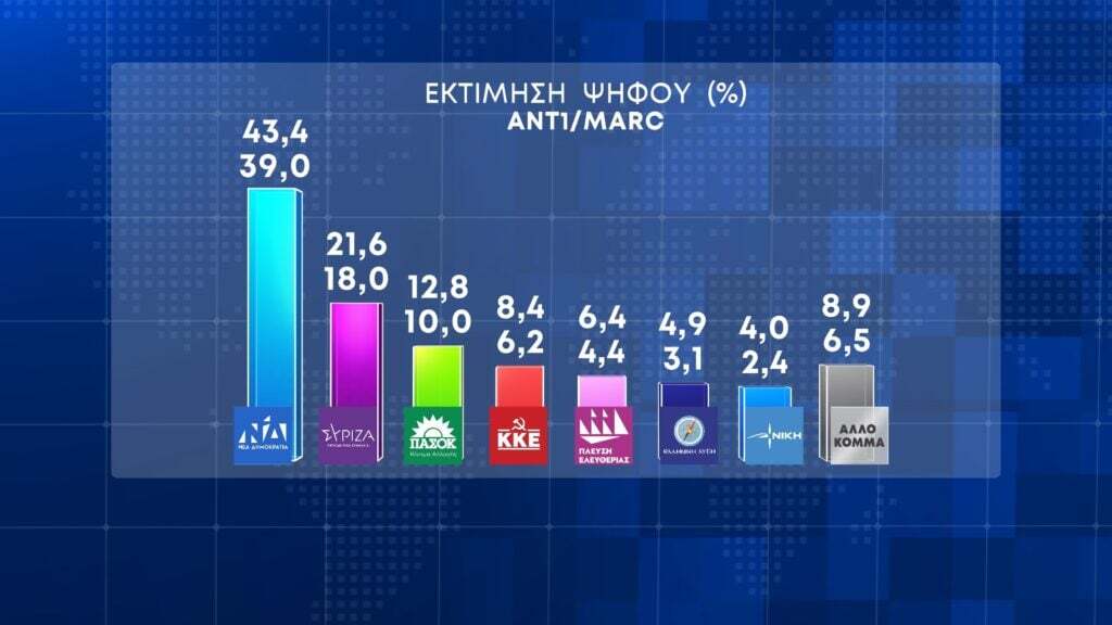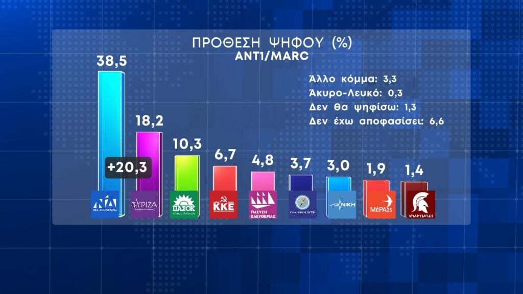 Στις 20,3 μονάδες καταγράφει το προβάδισμα της Νέας Δημοκρατίας, η Marc σε δημοσκόπηση για λογαριασμό του ΑΝΤ1.