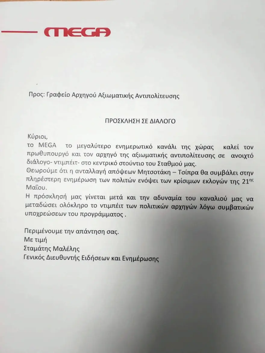 Θετικά ανταποκρίθηκε ο ΣΥΡΙΖΑ- Προοδευτική Συμμαχία στην πρόσκληση του τηλεοπτικού σταθμού Mega . Η Εκπρόσωπος Τύπου του ΣΥΡΙΖΑ Προοδευτική Συμμαχία, Πόπη Τσαπανίδου γνωστοποίησε πως «με χαρά αποδεχόμαστε την πρόσκληση του τηλεοπτικού σταθμού MEGA σε ανοιχτό διάλογο ντιμπέιτ μεταξύ του Αλέξη Τσίπρα και του Κυριάκου Μητσοτάκη και πως είναι στη διάθεση του καναλιού, όποια μέρα επιθυμεί τροποποιώντας το πρόγραμμα του προέδρου για να γίνει ο δημόσιος διάλογος που θα συμβάλει στην ενημέρωση των πολιτών».