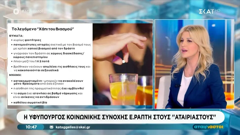 Η Υφυπουργός Κοινωνικής Συνοχής, Ελένα Ράπτη, μιλώντας στην εκπομπή του ΣΚΑΪ «Αταίριαστοι», παρουσίασε την πρωτοβουλία του Υπουργείου για την ευαισθητοποίηση σχετικά με το λεγόμενο «χάπι του βιασμού», καλώντας μαθητές και φοιτητές να συμμετάσχουν ενεργά στην καμπάνια.