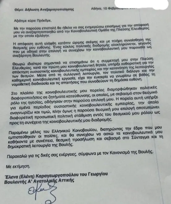 «Η απόφασή μου να συνεχίσω ως ανεξάρτητη Βουλευτής είναι αποτέλεσμα μιας διαφορετικής πολιτικής στάθμισης ως προς τον τρόπο άσκησης του κοινοβουλευτικού ρόλου και την ανάγκη ενίσχυσης του ουσιαστικού κοινοβουλευτικού ελέγχου. Στο πλαίσιο της κοινοβουλευτικής μου πορείας διαμορφώθηκαν πολιτικές διαφοροποιήσεις σε ζητήματα κατεύθυνσης και λειτουργίας, οι οποίες με οδήγησαν στη συγκεκριμένη θεσμική επιλογή. Η επιλογή αυτή δεν συνιστά πράξη αντιπαράθεσης, αλλά πολιτική διαφοροποίηση ως προς την κοινοβουλευτική κατεύθυνση και τον τρόπο άσκησης του ρόλου μου. Παραμένω στη Βουλή για να υπηρετώ με συνέπεια τη λαϊκή εντολή, ασκώντας ενεργό και υπεύθυνη αντιπολίτευση».