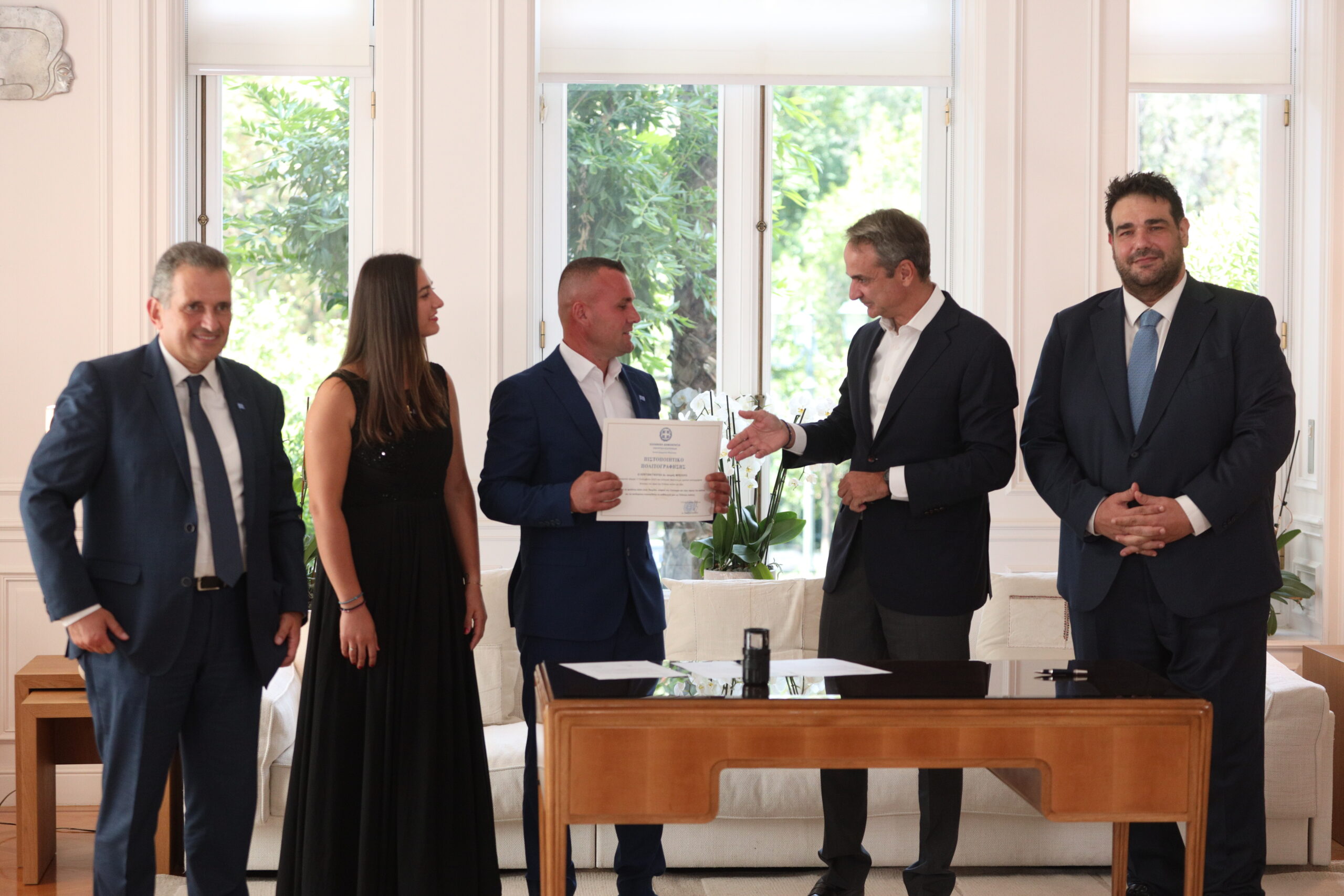 Ο Γκόγκα Λεντιάν έδωσε τον όρκο του Έλληνα πολίτη ενώπιον του πρωθυπουργού Κυριάκου Μητσοτάκη, παρουσία του υπουργού Εσωτερικών Θοδωρή Λιβάνιου και του γενικού γραμματέα Ιθαγένειας Δημήτρη Κάρναβου.