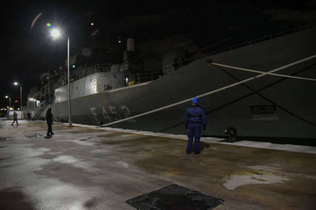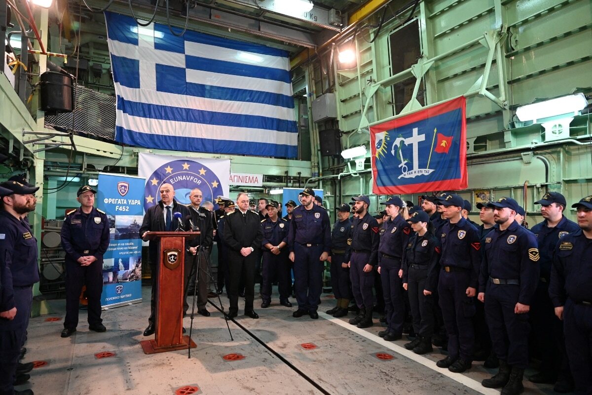 Ο υπουργός Εθνικής Άμυνας Νίκος Δένδιας επισκέφτηκε νωρίτερα το πλήρωμα της φρεγάτας και έκανε τις ακόλουθες δηλώσεις, ενόψει του απόπλου: «Η συμμετοχή της Φρεγάτας, μαζί με την ανάληψη της διοίκησης του επιχειρησιακού στρατηγείου από την Ελλάδα με Έλληνα Διοικητή, εξυπηρετεί πρωτίστως τα εθνικά συμφέροντα». «Έχω απόλυτη επίγνωση ότι η πατρίδα σάς στέλνει σε μια ζώνη κινδύνου» τόνισε ο υπουργός στα μέλη του πληρώματος.