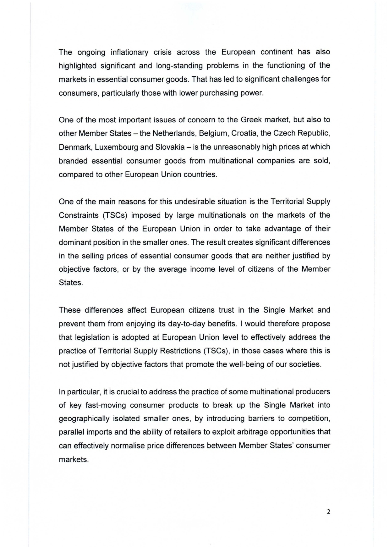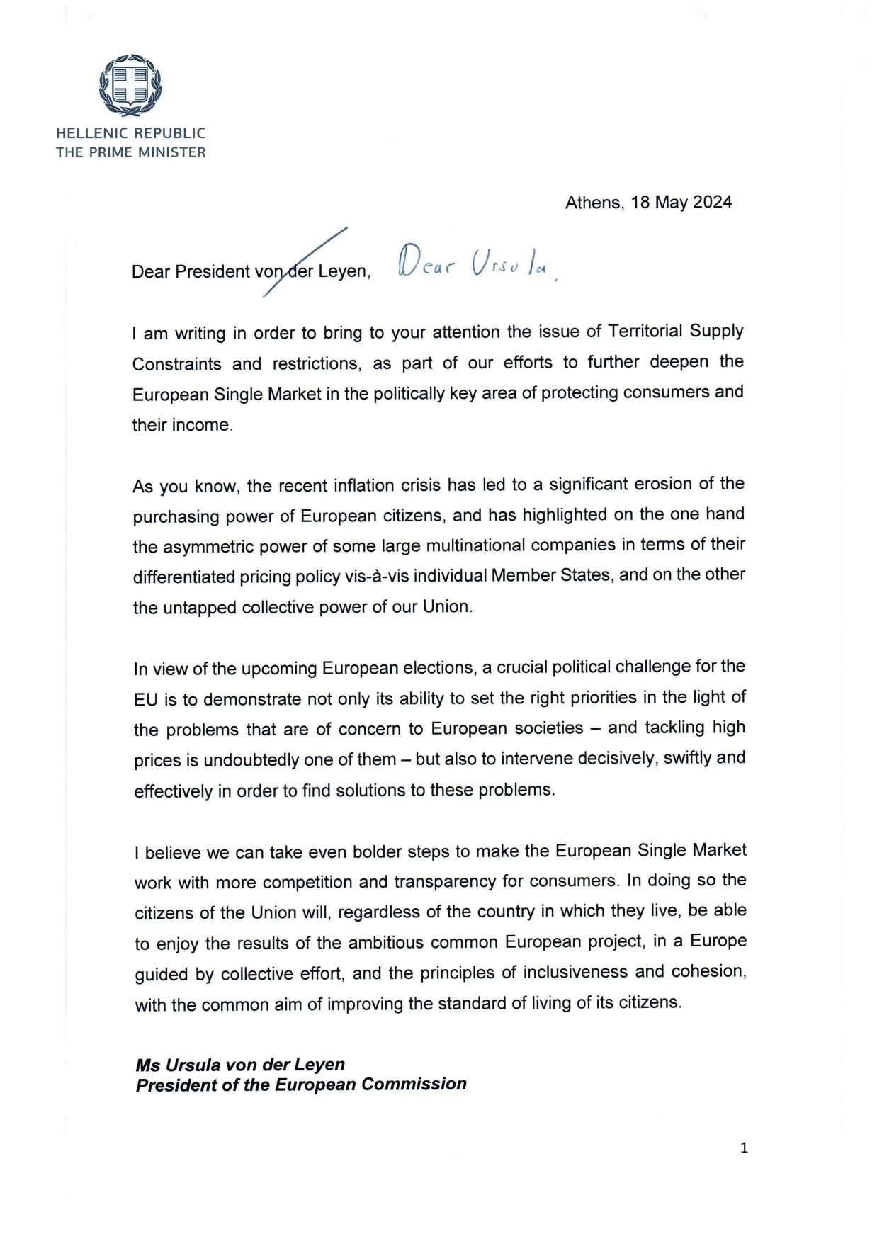 «Η πρόσφατη πληθωριστική κρίση, που οδήγησε σε σημαντική διάβρωση της αγοραστικής δύναμης των ευρωπαίων πολιτών, ανέδειξε τόσο την ασύμμετρη δύναμη που έχουν πολυεθνικοί κολοσσοί ως προς την διαφοροποιημένη τιμολογιακή πολιτική που ακολουθούν έναντι μεμονωμένων κρατών μελών, όσο και την αναξιοποίητη συλλογική της ένωσής μας» επισημαίνει ο πρωθυπουργός.