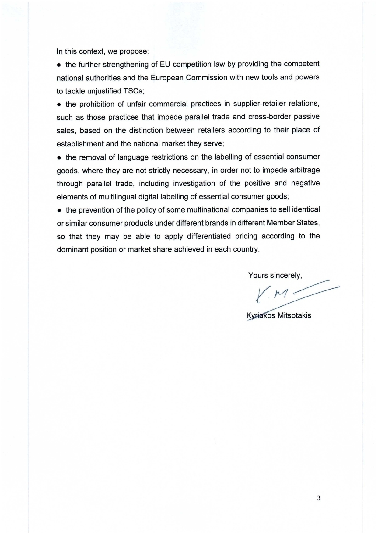 Με την παρούσα επιστολή θα ήθελα να αναδείξω την ανάγκη για την περαιτέρω εμβάθυνση της Ευρωπαϊκής Ενιαίας Αγοράς στο πολιτικά κρίσιμο πεδίο της προστασίας των καταναλωτών και των εισοδημάτων τους.