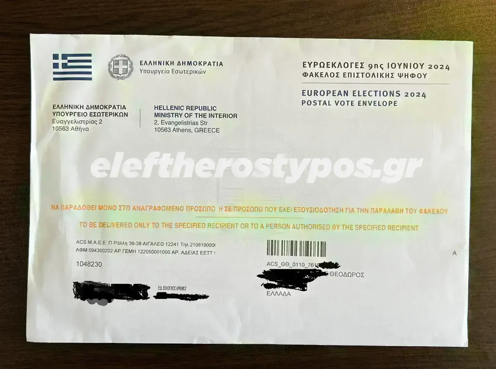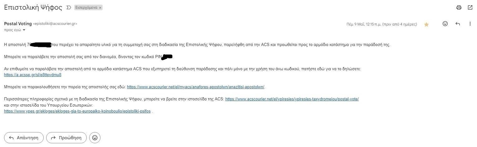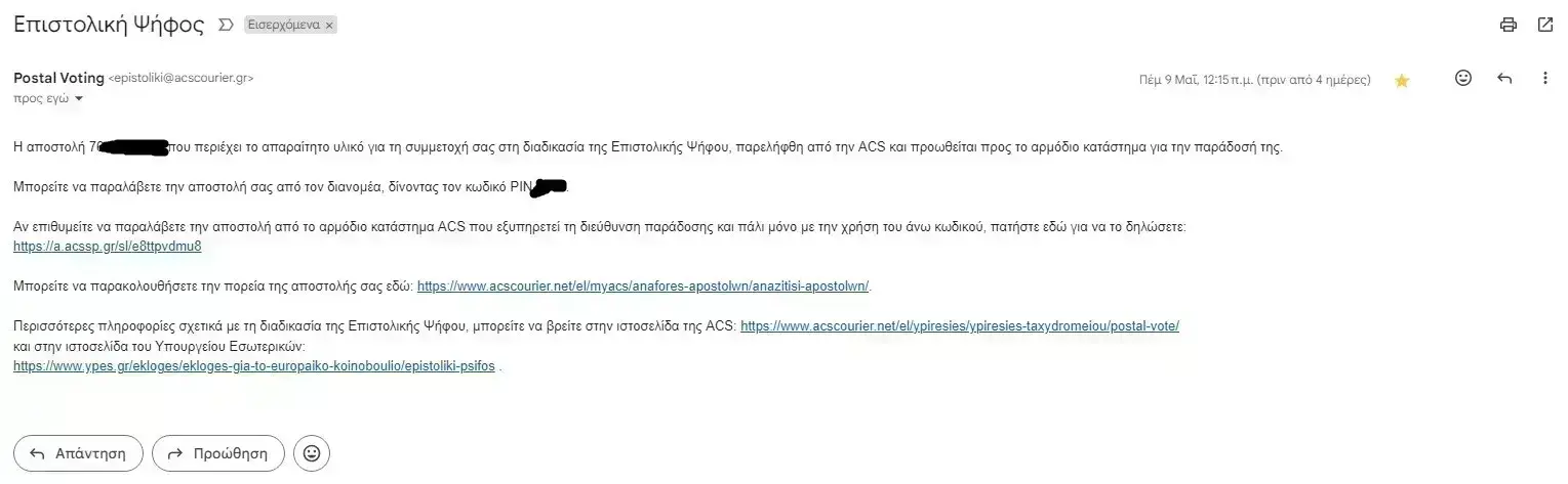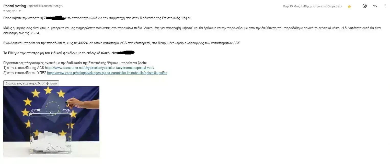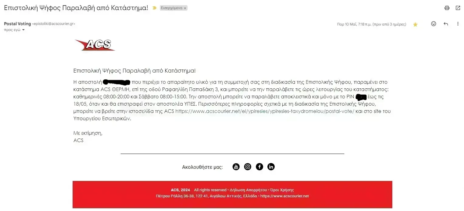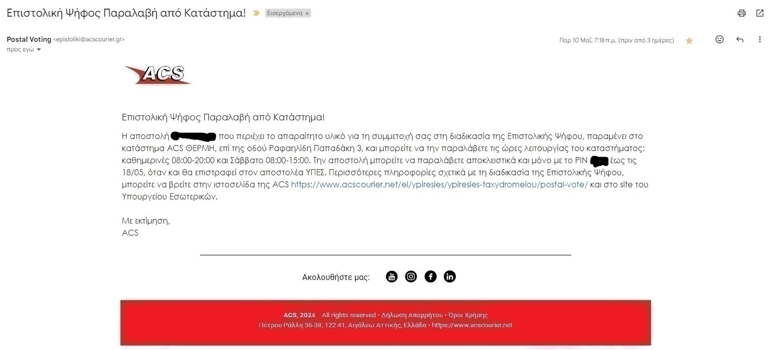 Εναλλακτικά μπορείτε να την παραδώσετε, έως τις 4/6/24, σε όποιο κατάστημα ACS σας εξυπηρετεί, στο διευρυμένο ωράριο λειτουργίας των καταστημάτων ACS. Το ΡΙΝ για την επιστροφή του ειδικού φακέλου με το εκλογικό υλικό, είναι ******», ανέφερε το μήνυμα.