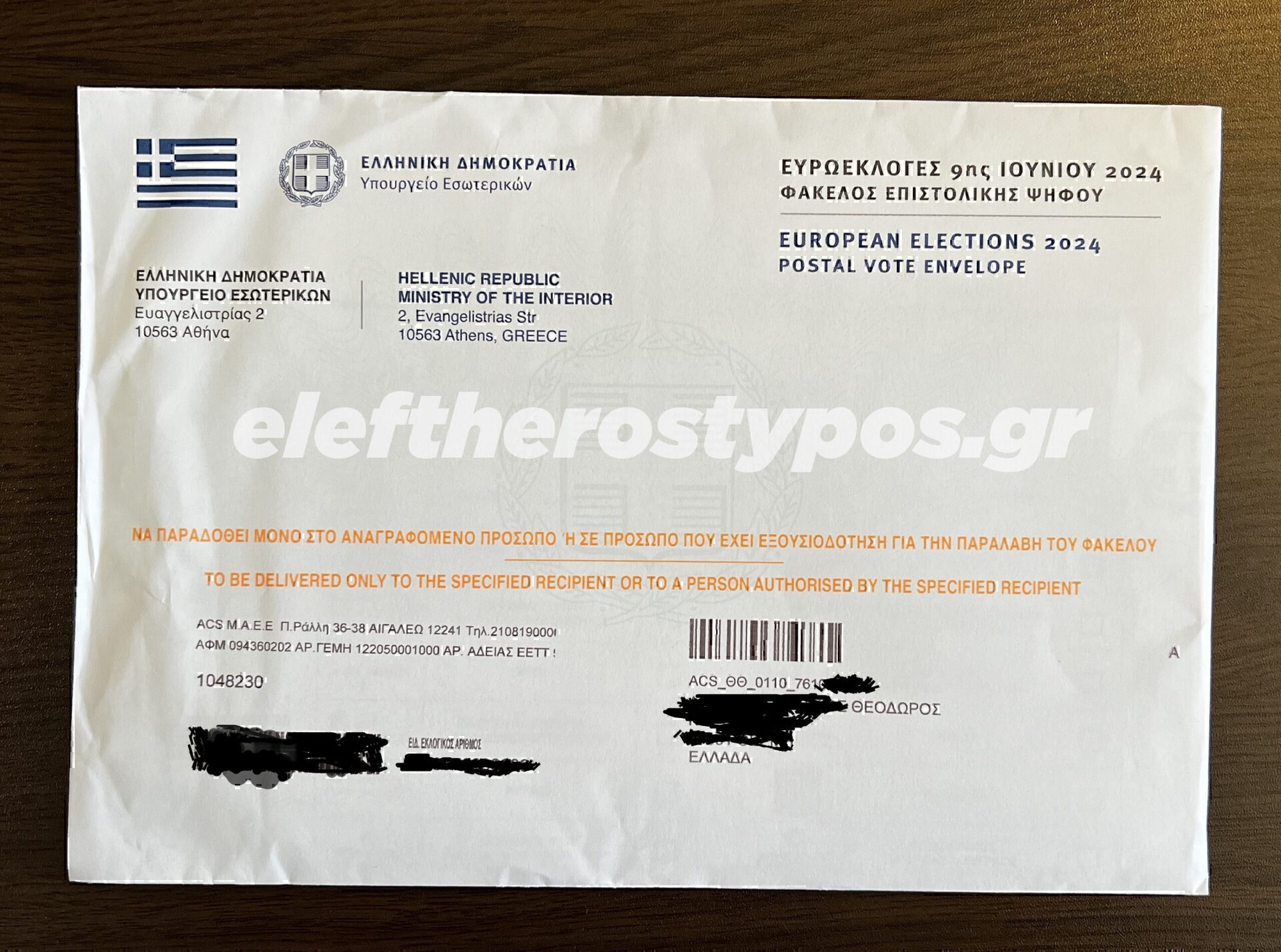 Ακριβώς ένα μήνα πριν από την κάλπη της 9ης Ιουνίου, η εταιρία κούριερ μου έστειλε e-mail με το οποίο με ενημέρωνε ότι: «η αποστολή *********** που περιέχει το απαραίτητο υλικό για τη συμμετοχή σας στη διαδικασία της Επιστολικής Ψήφου, παρελήφθη από την ACS και πρoωθείται προς το αρμόδιο κατάστημα για την παράδοσή της.