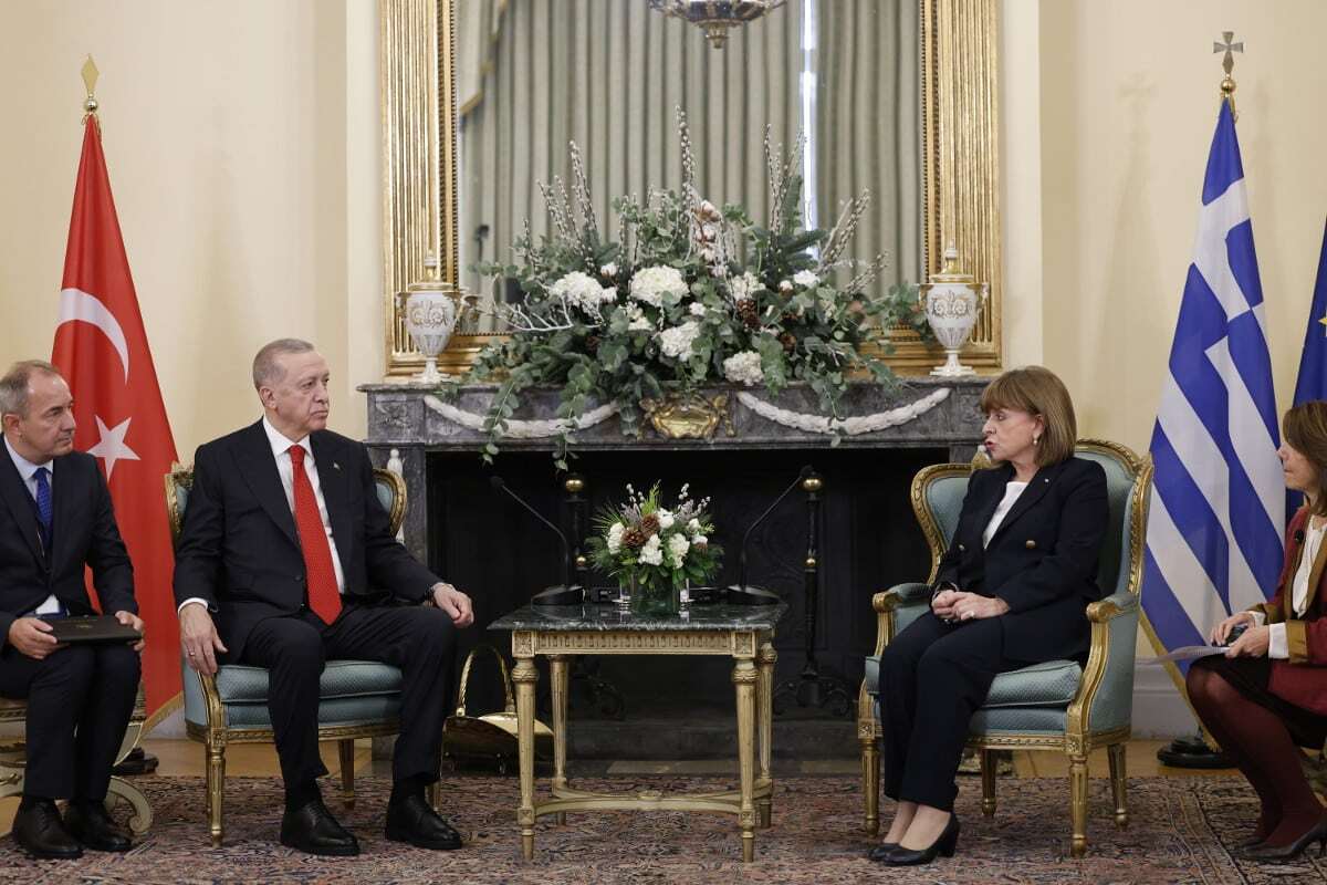 Η Κατερίνα Σακελλαροπούλου υποδέχθηκε τον Τούρκο ομόλογό της στην είσοδο του Προεδρικού Μεγάρου και αφού μπήκαν στο εσωτερικό ακολούθησε ο διάλογός τους μπροστά στις κάμερες.