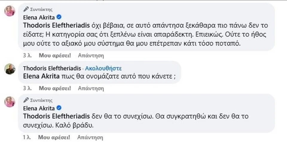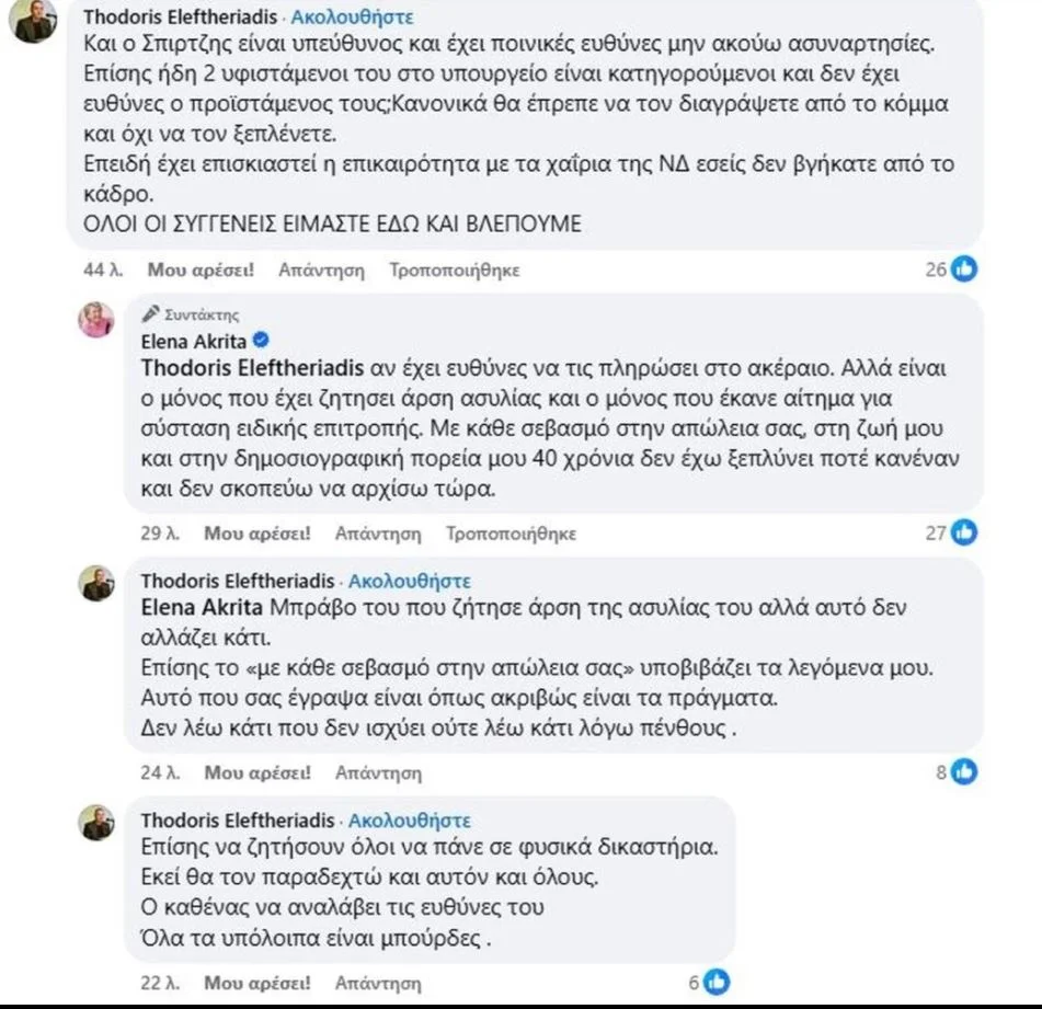 Ο Θοδωρής Ελευθεριάδης σχολιάζοντας την κίνηση της Έλενας Ακρίτα έγραψε: «Η κυρία Έλενα Ακρίτα διέγραψε τελικά το ποστ στο οποίο ξέπλενε τον Σπίρτζη και επιτέθηκε λεκτικά σε μένα (όταν της επισήμανα ότι κάνει ξέπλυμα). Μα γιατί κυρία Ακρίτα; Δεν έχετε το θάρρος της άποψης σας; Δεν είμαι απαράδεκτος ακόμη που ρίχνω ευθύνες στον Σπίρτζη για τον θάνατο της μάνας μου;».
