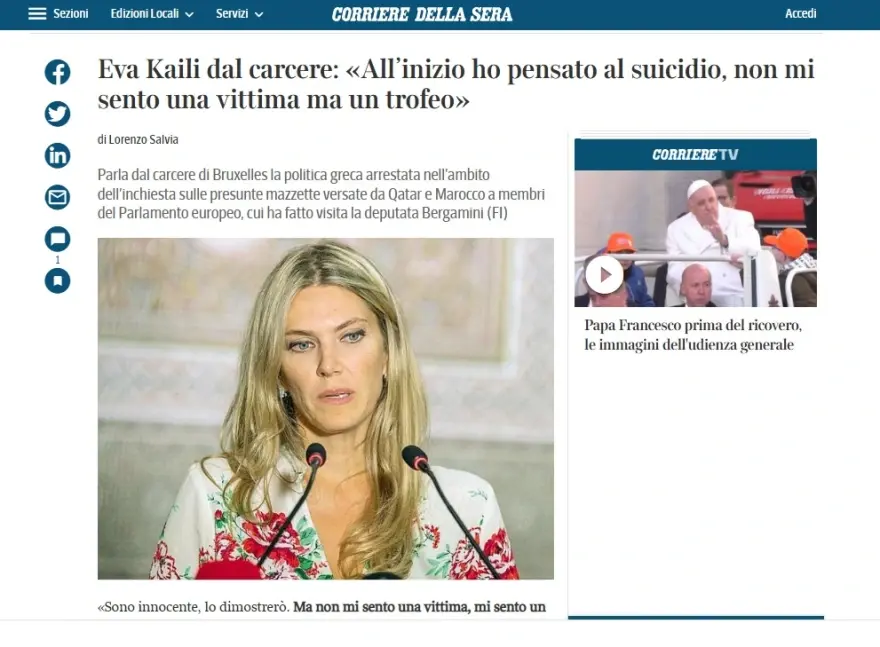 Η Ιταλίδα πολιτικός υποστηρίζει, τέλος, ότι είδε συναισθηματικά ταλαιπωρημένη αλλά μαχητική και όχι με κατάθλιψη την Εύα Καϊλή: «Η έρευνα θα συνεχίσει την πορεία της, όπως πρέπει να κάνει, αλλά επαναλαμβάνω ότι το τεκμήριο της αθωότητας πρέπει να ισχύει για όλους. Είμαι έκπληκτη από την σιωπή των πολιτικών και την υποκρισία γύρω από αυτή την ιστορία».