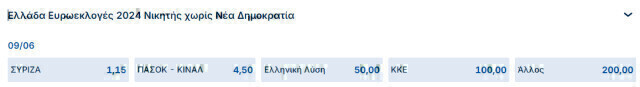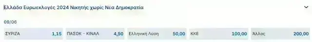 Το μεγάλο ερώτημα για τις Ευρωεκλογές 2024 όσον αφορά και το στοίχημα είναι το ποσοστό της Νέας Δημοκρατίας. Είδαμε πως στις περσινές βουλευτικές εκλογές, το κόμμα της Κεντροδεξιάς επικράτησε με ευρεία νίκη, ξεπερνώντας το 40%. Το στοίχημα από πλευράς Κυριάκου Μητσοτάκη είναι να διατηρήσει το κόμμα του το ποσοστό των Ευρωεκλογών του 2019, ήτοι το 33,12%. Θυμίζουμε άλλωστε πως οι Ευρωεκλογές έχουν χαρακτήρα… χαλαρής ψήφου και ενόσω τα ζητήματα της ακρίβειας, των υποκλοπών, του κράτους δικαίου, αλλά και του δυστυχήματος των Τεμπών παραμένουν στην επιφάνεια.