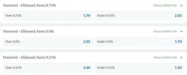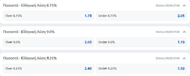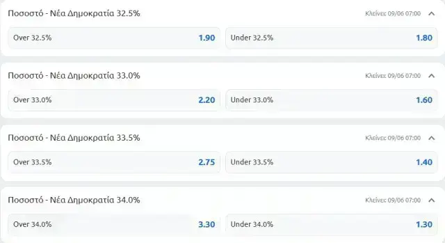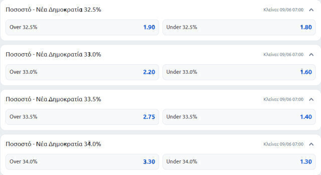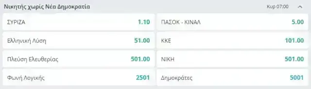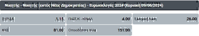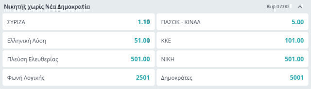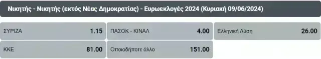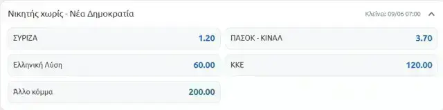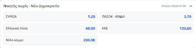 Σύμφωνα με τα στοιχεία δεν προσφέρεται η επιλογή για τον νικητή της κάλπης. Αντίθετα, έχουν τοποθετηθεί οι σχετικές αποδόσεις για τις υπόλοιπες θέσεις, τόσο σχετικά με τη μάχη για τη δεύτερη θέση, όσο την αντίστοιχη στην «ουρά», όπου «παίζουν» αρκετές επιλογές στο εκλογικό όριο.