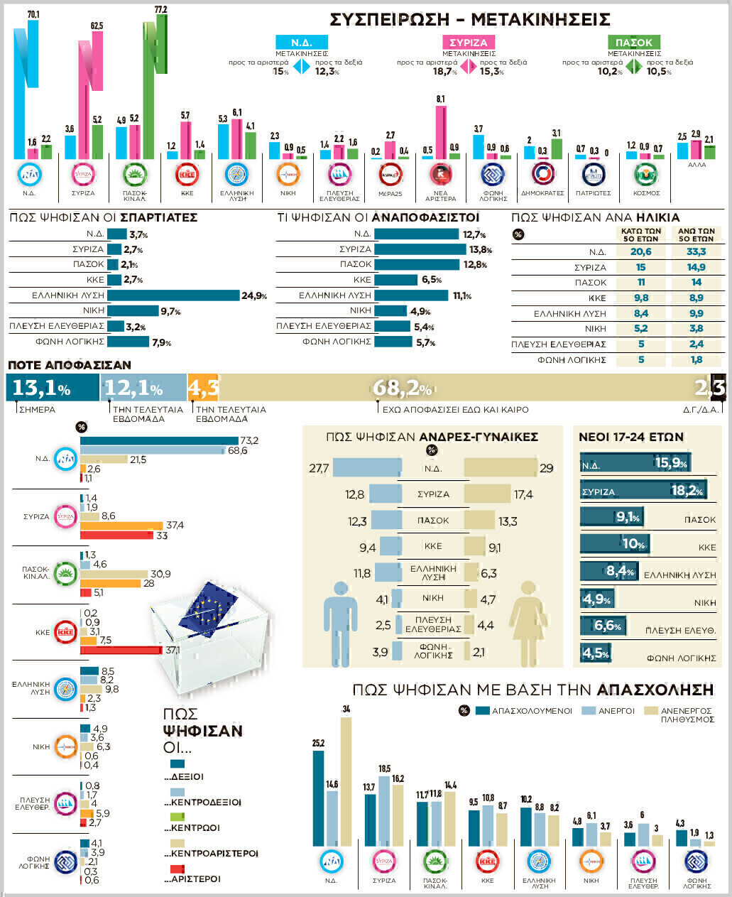 Μάλιστα, η χαμηλή επίδοση της Νέας Δημοκρατίας μεταξύ των αναποφάσιστων ψηφοφόρων (σημειώνεται εδώ ότι περίπου ένας στους τέσσερις αποφάσισαν είτε πάνω από την κάλπη είτε μερικές μέρες πριν), όπου συγκέντρωσε μόλις 12,7%, ενώ οι προεκλογικές δημοσκοπήσεις έδειχναν ότι αυτοί προέρχονται (σε σχεδόν τριπλάσιο ποσοστό) από τη Νέα Δημοκρατία, δείχνει ότι μάλλον οι ψηφοφόροι της δεν πείστηκαν από το διακύβευμα της κυβερνητικής σταθερότητας που τέθηκε προεκλογικά από τον πρωθυπουργό και κατευθύνθηκαν είτε με χαλαρότητα προς τις παραλίες είτε με διάθεση να στείλουν μήνυμα διαμαρτυρίας προς τις κάλπες.