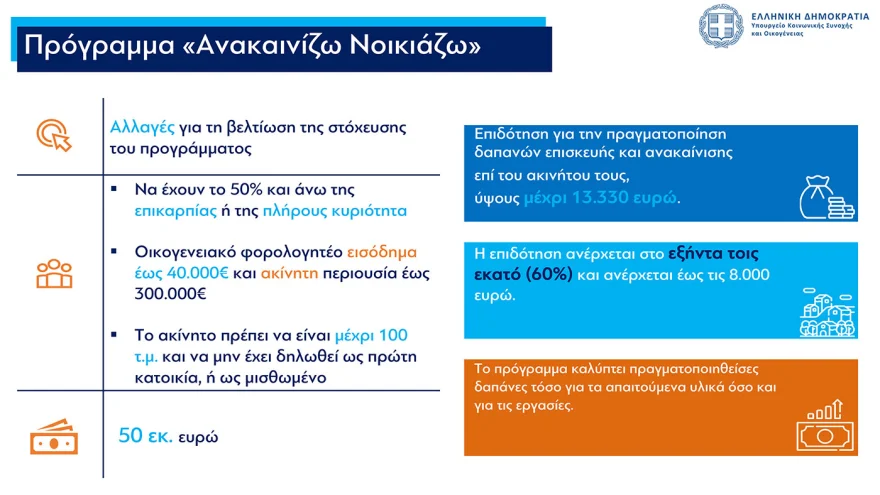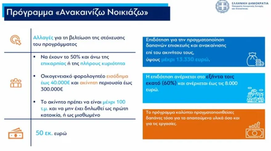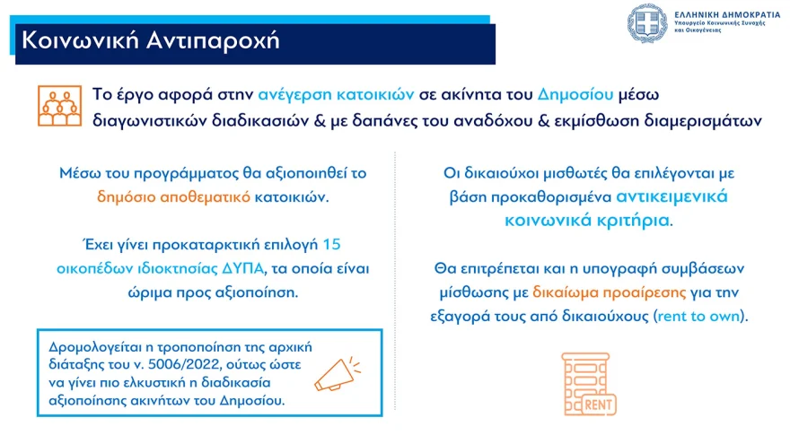 Ακολούθως ανακοινώθηκε το πρόγραμμα «Ανακαινίζω Νοικιάζω» με επιδότηση άνω του 60%. Την ίδια στιγμή θεσπίζεται η κοινωνική αντιπαροχή για την οποία αναμένεται η σχετική διάταξη μέχρι τις αρχές Οκτωβρίου.