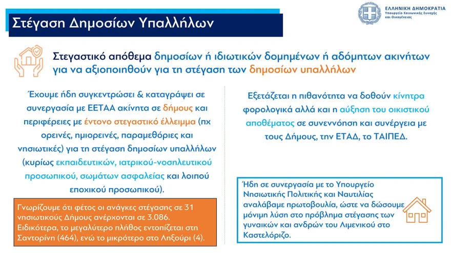 Το 2023 οι ανάγκες για δασκάλους και γιατρούς σε 31 νησιωτικούς δήμους ανέρχονταν σε 3.086 άτομα. «Αναζητούμε μικτό σχήμα να αξιοποιήσουμε δημοτική περιουσία για τη στέγασή τους», τόνισε κ. Ζαχαράκη προσθέτοντας ότι θα αξιοποιηθούν κενά αστυνομικά κτίρια και σχολεία.