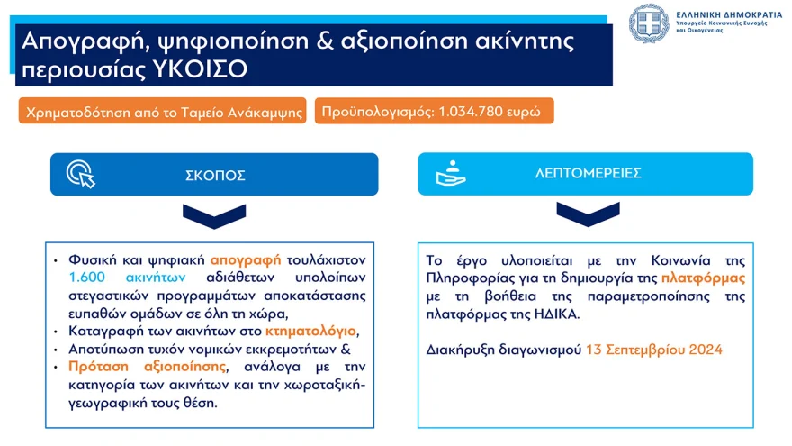 Απογραφή, ψηφιοποίηση και αξιοποίηση ακίνητης περιουσίας του Υπουργείου Κοινωνικής Συνοχής και Οικογένειας