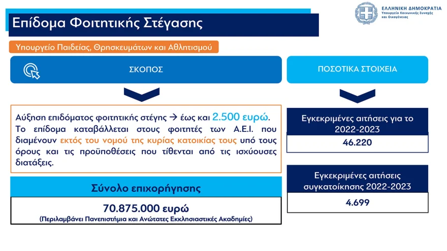 Σκοπός είναι η αύξηση επιδόματος φοιτητικής στέγης έως και 2.500 ευρώ. Το επίδοµα καταβάλλεται στους φοιτητές των Α.Ε.Ι. που διαμένουν εκτός του νοµού της κυρίας κατοικίας τους υπό τους όρους και τις προϋποθέσεις που τίθενται από τις ισχύουσες διατάξεις.